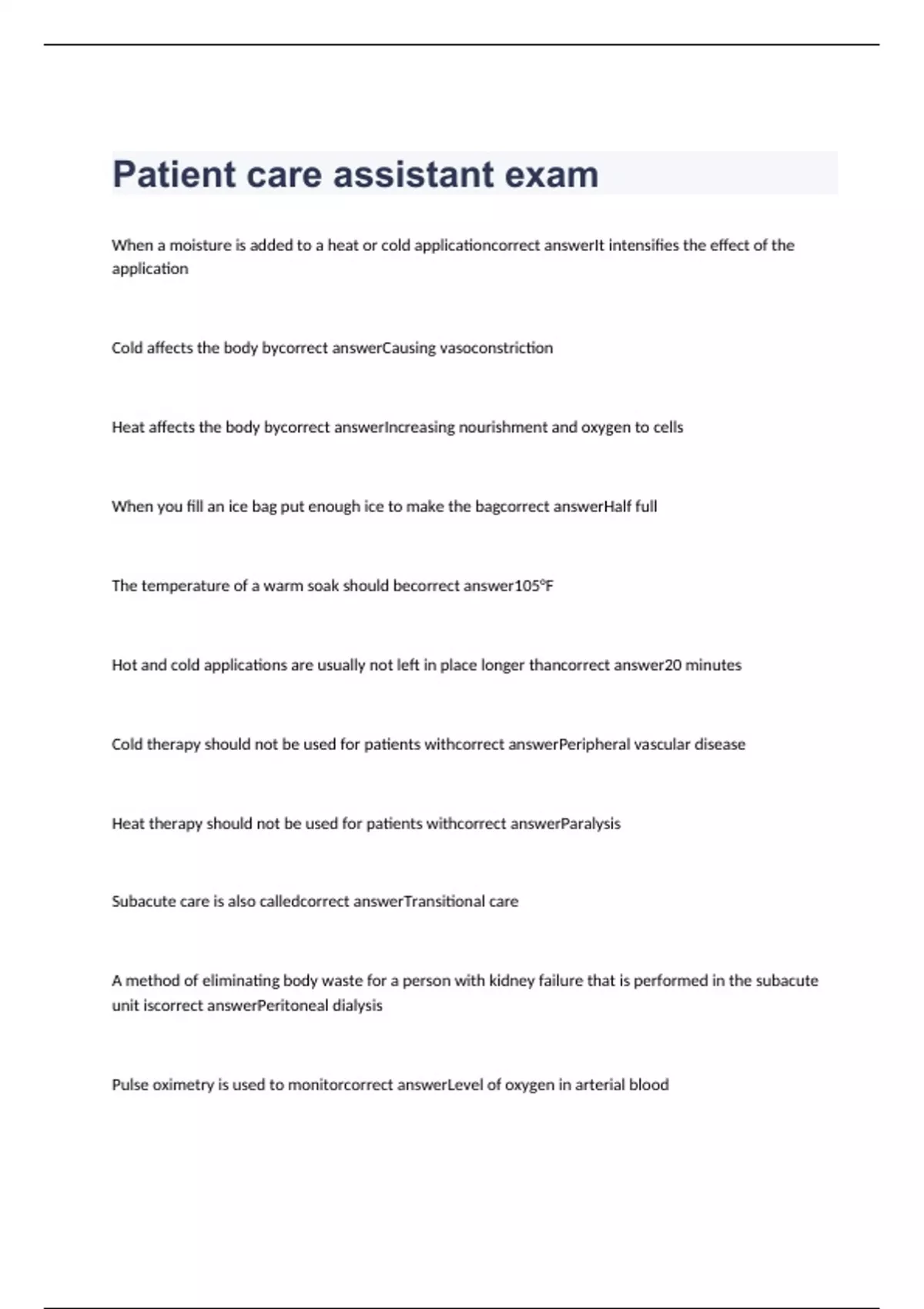 Patient care assistant exam questions with correct answers