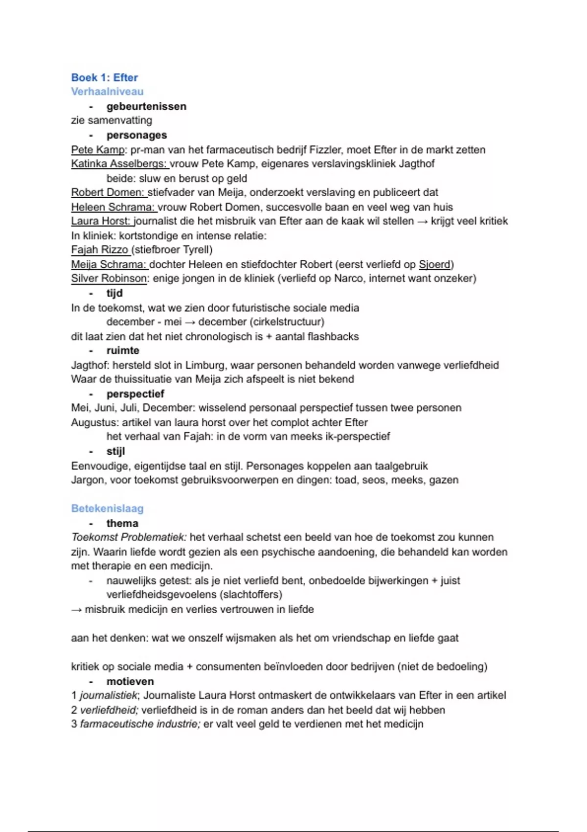 Efter Hanna Bervoets uitgewerkt 6VWO boekenmondeling (2023) Hierbij verschillende literaire begrippen uitgewerkt over het boek Efter van Hanna Bervoets. Erg handig voor het boekenmondeling in zowel 4VWO, 5VWO en 6VWO. Zelf heb ik hiermee een 8,0 gehaald. Ik hoop dat jullie er wat aan hebben.