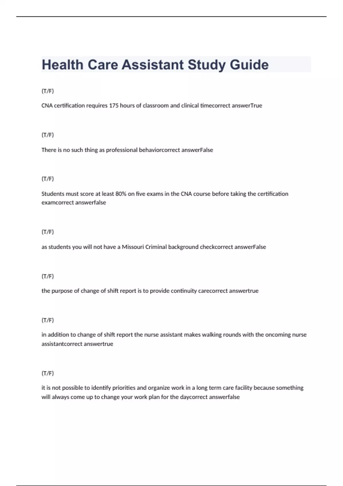 Health Care Assistant Study Guide questions with correct answers