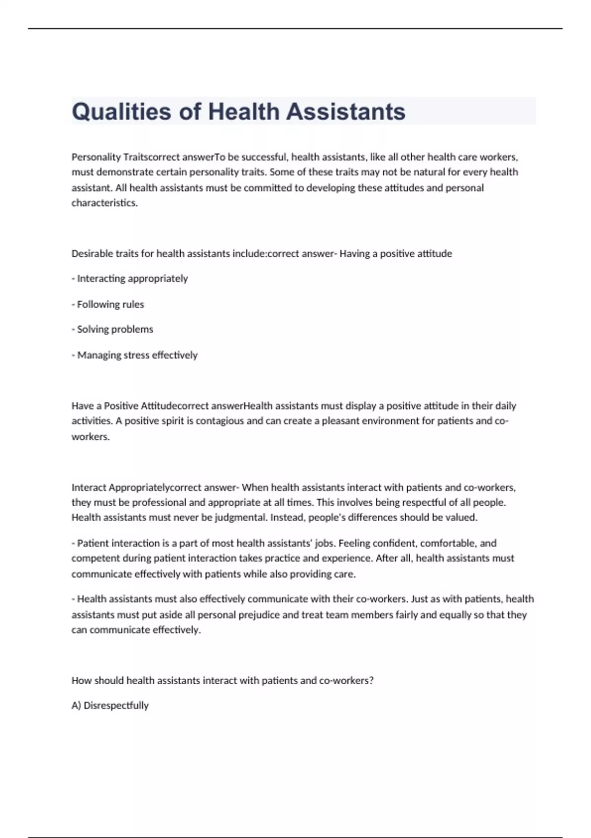 Personality Traitscorrect answerTo be successful, health assistants, like all other health care workers,