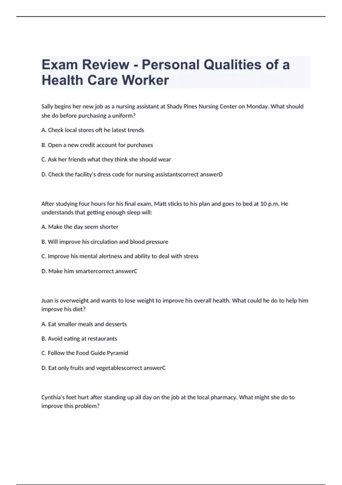 Exam Review - Personal Qualities of a Health Care Worker questions with correct answer