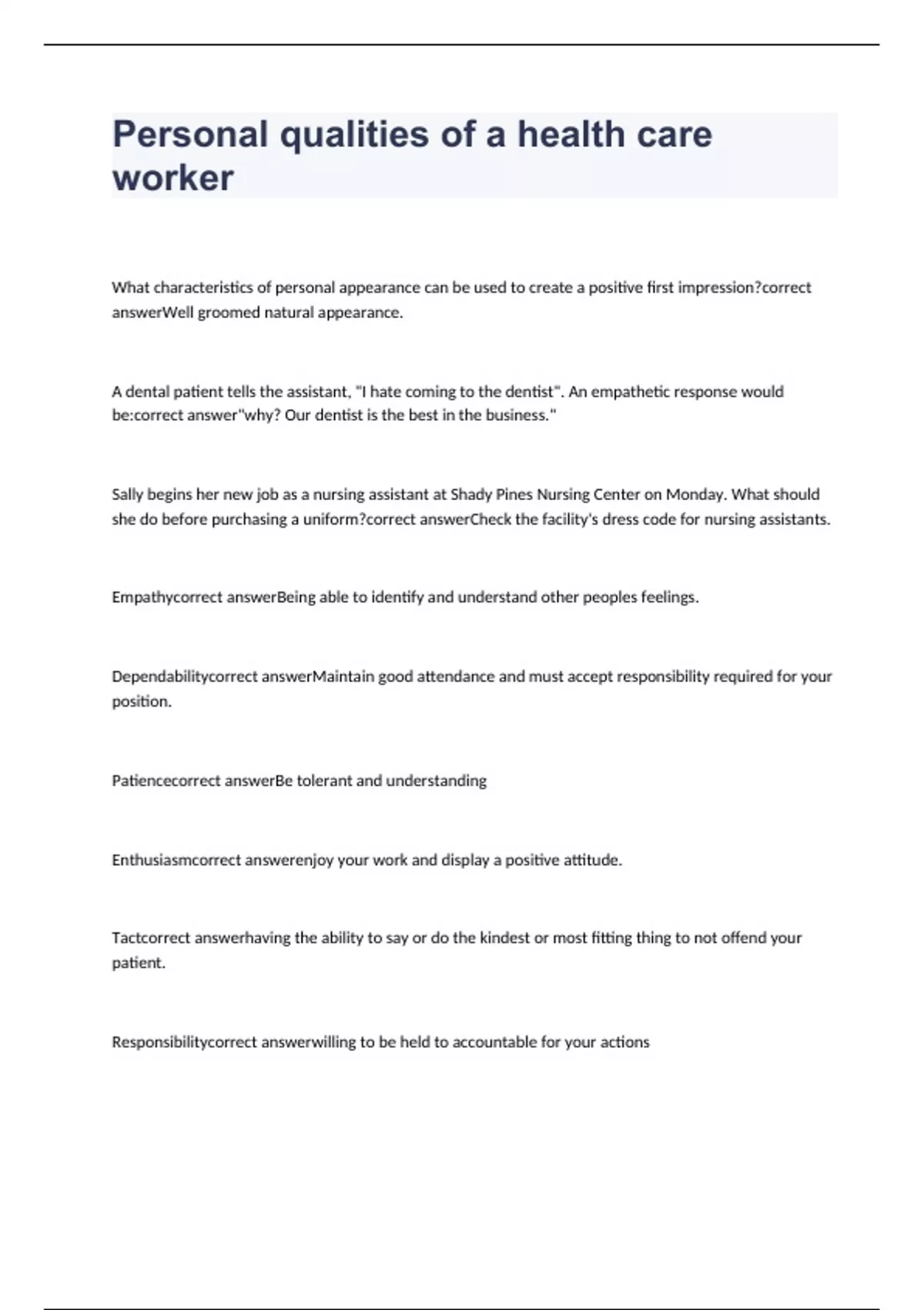Sally begins her new job as a nursing assistant at Shady Pines Nursing Center on Monday. What should