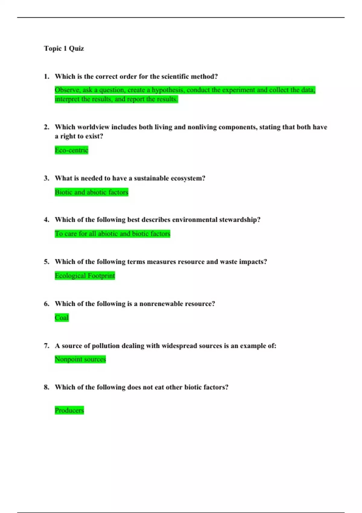 1. Question:Which is the correct order for the scientific method? 2. Question:Which worldview includes both living and nonliving components, stating that both have a right to exist? 3. Question:What is needed to have a sustainable ecosystem? 4. Question:Which of the following best describes environmental stewardship? 5. Question:Which of the following terms measures resource and waste impacts? 6. Question:Which of the following is a nonrenewable resource? 7. Question:A source of pollution dealing with widespread sources is an example of: 8. Question:Which of the following does not eat other biotic factors? 9. Question:Which of the following breaks down organic material and recycles the nutrients back to the Earth? 10. Question:Which of the following best describes environmental Science?