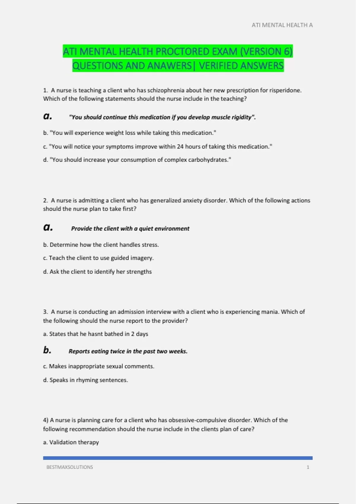 ATI MENTAL HEALTH PROCTORED EXAM (VERSION 6) QUESTIONS AND ANAWERS| VERIFIED ANSWERS 1. A nurse is teaching a client who has schizophrenia about her new prescription for risperidone. Which of the following statements should the nurse include in the teaching? a. "You should continue this medication if you develop muscle rigidity". b. "You will experience weight loss while taking this medication." c. "You will notice your symptoms improve within 24 hours of taking this medication." d. "You should increase your consumption of complex carbohydrates." 2. A nurse is admitting a client who has generalized anxiety disorder. Which of the following actions should the nurse plan to take first? a. Provide the client with a quiet environment b. Determine how the client handles stress. c. Teach the client to use guided imagery. d. Ask the client to identify her strengths 3. A nurse is conducting an admission interview with a client who is experiencing mania. Which of the following should the nurse report to the provider? a. States that he hasnt bathed in 2 days b. Reports eating twice in the past two weeks. c. Makes inappropriate sexual comments. d. Speaks in rhyming sentences. 4) A nurse is planning care for a client who has obsessive-compulsive disorder. Which of the following recommendation should the nurse include in the clients plan of care? a. Validation therapy b. Thought stopping c. Operant conditioning d. Reality orientation therapy 5) A nurse is caring for a client who has bipolar disorder and is experiencing a manic episode. Which of the following actions should the nurse take? a. Encourage the client to join group activities b. Dim the lights in the clients room c. Provide detailed explanations to the client d. Administer methylphenidate 6. A nurse is leading a crisis intervention group for adolescents who witnessed the suicide of a classmate. Which of the following actions should the nurse take first. a. Initiate referrals b. Review community resources c. Identify prior coping skills d. Discuss the importance of confidentiality 7. A nurse overhears a client saying"I am a spy, a spy for the FBI .I am an I,an eye for an eye in the sky. Sky is up high." The nurse should document the clients statement as which of the following speech alterations? a. Echolalia b. Word salad c. Neologism d. Clang association 8. An older adult client is brought to the mental health clinic by her daughter. The daughter reports that her mother is not eating and seems uninterested in routine activities. The daughter states "Im so worried that my mother is depressed" which of the following responses should the nurse make? a. Everyone gets depressed from time to time. b. You shouldnt worry about this because depressive disorder is easily treated. c. Older adults are usually diagnosed with depressive disorder as they age. d. Tell me the reasons you think your mother is depressed.