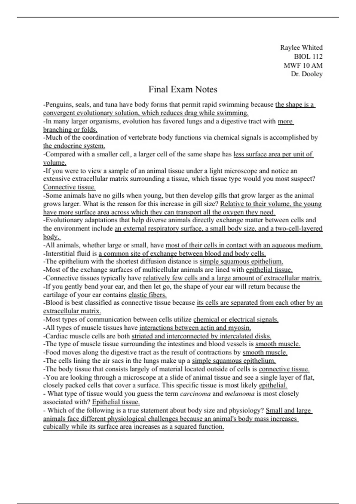 These are the notes used to study for and during the exam for Organismal Biology 1, aka BIOL 112. They include underlined sections that are important or were emphasized during class and other assignments/review sessions.
