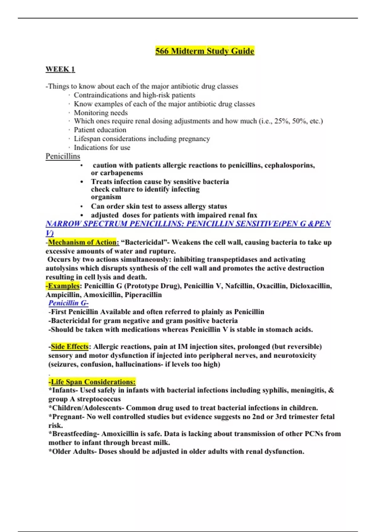 -Things to know about each of the major antibiotic drug classes • Contraindications and high-risk patients • Know examples of each of the major antibiotic drug classes • Monitoring needs • Which ones require renal dosing adjustments and how much (i.e., 25%, 50%, etc.) • Patient education • Lifespan considerations including pregnancy • Indications for use Penicillins • caution with patients allergic reactions to penicillins, cephalosporins, or carbapenems • Treats infection cause by sensitive bacteria check culture to identify infecting organism • Can order skin test to assess allergy status • adjusted doses for patients with impaired renal fnx NARROW SPECTRUM PENICILLINS: PENICILLIN SENSITIVE(PEN G &PEN V) -Mechanism of Action: “Bactericidal”- Weakens the cell wall, causing bacteria to take up excessive amounts of water and rupture. Occurs by two actions simultaneously: inhibiting transpeptidases and activating autolysins which disrupts synthesis of the cell wall and promotes the active destruction resulting in cell lysis and death. -Examples: Penicillin G (Prototype Drug), Penicillin V, Nafcillin, Oxacillin, Dicloxacillin, Ampicillin, Amoxicillin, Piperacillin Penicillin G- -First Penicillin Available and often referred to plainly as Penicillin -Bactericidal for gram negative and gram positive bacteria -Should be taken with medications whereas Penicillin V is stable in stomach acids. -Side Effects: Allergic reactions, pain at IM injection sites, prolonged (but reversible) sensory and motor dysfunction if injected into peripheral nerves, and neurotoxicity (seizures, confusion, hallucinations- if levels too high) . -Life Span Considerations: *Infants- Used safely in infants with bacterial infections including syphilis, meningitis, & group A streptococcus *Children/Adolescents- Common drug used to treat bacterial infections in children. *Pregnant- No well controlled studies but evidence suggests no 2nd or 3rd trimester fetal risk. *Breastfeeding- Amoxicillin is safe. Data is lacking about transmission of other PCNs from mother to infant through breast milk. *Older Adults- Doses should be adjusted in older adults with renal dysfunction. Penicillin Allergy: -Most common drug allergy to date with severity ranging from minor rash to anaphylaxis -Can possibly display cross sensitivity to cephalosporins and should not be used if possible -observed 30 minutes minimum post drug injection for adverse reactions -For history of PCN allergy, a skin allergy test can be done to assess current risk by injecting a tiny amount of allergen ID (only to be done where epinephrine and respiratory support is available if needed) Penicillin V- • Stable in stomach acid (Pen G is not) • Used for oral therapy, can be taken with meals NARROW SPECTRUM PENICILLIN: PENICILLIN RESISTANT: (Nafcillin, Oxacillin, Dicloxacillin) -Treats S. aureus and S. epidermidis Broad-Spectrum Penicillins (Ampicillin & Amoxicillin): -Most common side effects are rash and diarrhea (rash usually 3-10 days post TX start). -Therapy can be PO or IV and requires dosage adjustment for renal impairment -Treats Haemophilus influenzae, E. Coli, proteus mirabilis, enterococci, and Neisseria gonorrhoeae EXTENDED SPECTRUM PENICILLIN: (Piperacillin) -Treats same diseases as broad spectrum PLUS: *pseudomonas aeruginosa*, enterobacter spp, proteus, bacteroides fragilis, klebsiella spp -Can cause bleeding secondary to disrupting platelet function -Usually administered IV -Reduce dose in renal pt’s Cephalosporins (Cephalexin) -Bactericidal drug (similar to PCNs) -Increases activity against gram-negative agents -Increases ability to reach cerebral spinal fluid (CSF)-3rd,4th,5th generations -no routine lab monitoring -Administered IM or IV -Take cultures to determine sensitivity and infecting organism -Contraindicated in pt’s with severe allergic reaction to cephalosporins or penicillins - CAN CAUSE C. DIFF INFECTION (tell pt. To monitor for frequent stools) -Used to treat infants & neonates. Especially in otitis media and gonococcal and pneumococcal infections -Adverse Effects: Maculopapular rash, bronchospasm, anaphylaxis -Education: Patients should not consume alcohol First generation: tx’s staphylococci or streptococci Cefadroxil, Cefazolin, Cephalexin Second generation: TX’s H. Influenza, Klebsiella, pneumococci, staphylococci Cefaclor, Cefotetan, Cefoxitin, Cefurozime Third generation: tx’s pseudomonas aeruginosa, Neisseria gonorrhoeae, Klebsiella, Serratia Cefdinir, Cefotaxime, Cefpodoxime, Ceftazidime, Ceftriaxone Fourth generation: Pseudomonas aeruginosa Cefepine, Ceftolozane/tazobactam Fifth generation: Methicillin resistant Staphylococcus aureus Ceftaroline Carbapenems (Imipenem) -Patients on valproate for seizures not to give -Avoid in renal impairment pts -Adverse effects: N/V/D, seizures (rare), rashes, pruritus Vancomycin -Used for C. Diff infection -Treats S. Aureus and S. epidermidis, and MRSA -Monitor Vanco drug levels -Use caution in pt’s with renal impairment Telavancin -Black Box Warning: when used to tx hospital acquire or ventilator-associated bacterial pneumonia with creatinine clearance of less thn 50 ml/min, increased chance of mortality. Not safe in pregnancy Aztreonam -Adverse effects: pain & thrombophlebitis at injection site USES: -treats gram negative bacteria: E. Coli, salmonella, Shigella, Serratia, Klebsiellam Proteus, H. influenza, P. aeruginosa Fosfomycin -Single dose therapy in women with uncomplicated UTI -Adverse effects: diarrhea, headache, vaginitis, nausea, abdominal pain, rhinitis, drowsiness, dizziness, rash Tetracyclines (Tetracycline) -Broad spectrum bacteriostatic -Contraindication/Precautions: - After the 4th month of pregnancy can stain deciduous teeth and stain permanent teeth of children ages of 4 month and 8 years - If given to treat an STD, abstain from intercourse until med is finished. o Food decreases absorption • Complications o GI discomfort (cramping, nause