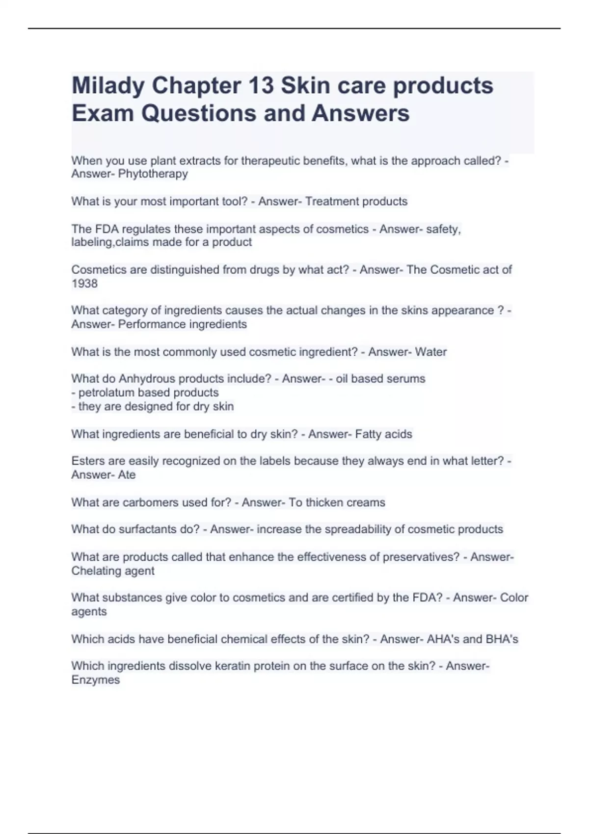 Milady Chapter 13 Skin care products Exam Questions and Answers