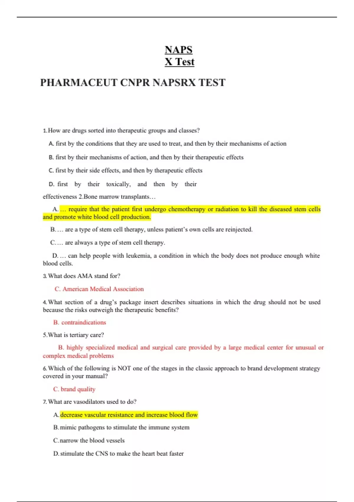 1. How are drugs sorted into therapeutic groups and classes? A. first by the conditions that they are used to treat, and then by their mechanisms of action B. first by their mechanisms of action, and then by their therapeutic effects C. first by their side effects, and then by therapeutic effects D. first by their toxically, and then by their effectiveness 2.Bone marrow transplants… A. … require that the patient first undergo chemotherapy or radiation to kill the diseased stem cells and promote white blood cell production. B. … are a type of stem cell therapy, unless patient’s own cells are reinjected. C. … are always a type of stem cell therapy. D. … can help people with leukemia, a condition in which the body does not produce enough white blood cells. 3. What does AMA stand for? C. American Medical Association 4. What section of a drug’s package insert describes situations in which the drug should not be used because the risks outweigh the therapeutic benefits? B. contraindications 5.What is tertiary care? B. highly specialized medical and surgical care provided by a large medical center for unusual or complex medical problems 6. Which of the following is NOT one of the stages in the classic approach to brand development strategy covered in your manual? C. brand quality 7. What are vasodilators used to do? A. decrease vascular resistance and increase blood flow B. mimic pathogens to stimulate the immune system C. narrow the blood vessels D. stimulate the CNS to make the heart beat faster 8. What is the name of the condition that occurs after a specific dose of a drug is given at such regular intervals that absorption and elimination (and therefore drug plasma concentration) have become constant? A. homeostasis B. steady state C. titration D. tolerance 9. Which statement is TRUE about ocular administration? A. Ocular administration is primarily for drugs that must cross the blood-brain barrier. B. Ocular administration is used primarily to treat the eye.’ C. Ocular administration is used when a drug must enter the bloodstream immediately. D. Ocular administration is used when a drug must produce immediate effects on the brain or spinal cord. 10. Which entity/entities invest(s) the most money in pharmaceutical R&D? A. Canadian pharmaceutical companies B. the NIH C. the U.S. Government D. U.S. pharmaceutical companies ............................................CONTINUE.