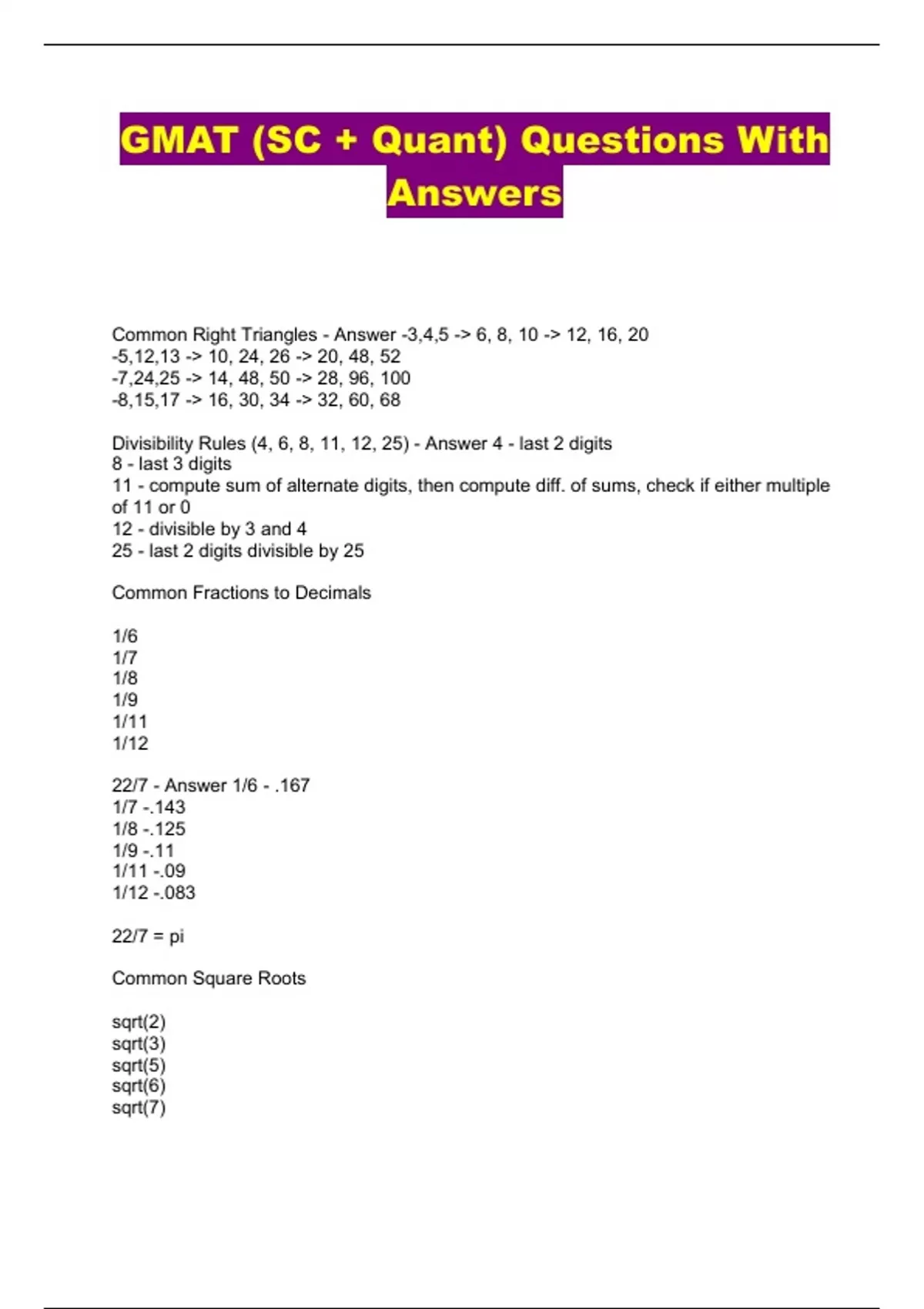 GMAT (SC + Quant) Questions With Answers...
