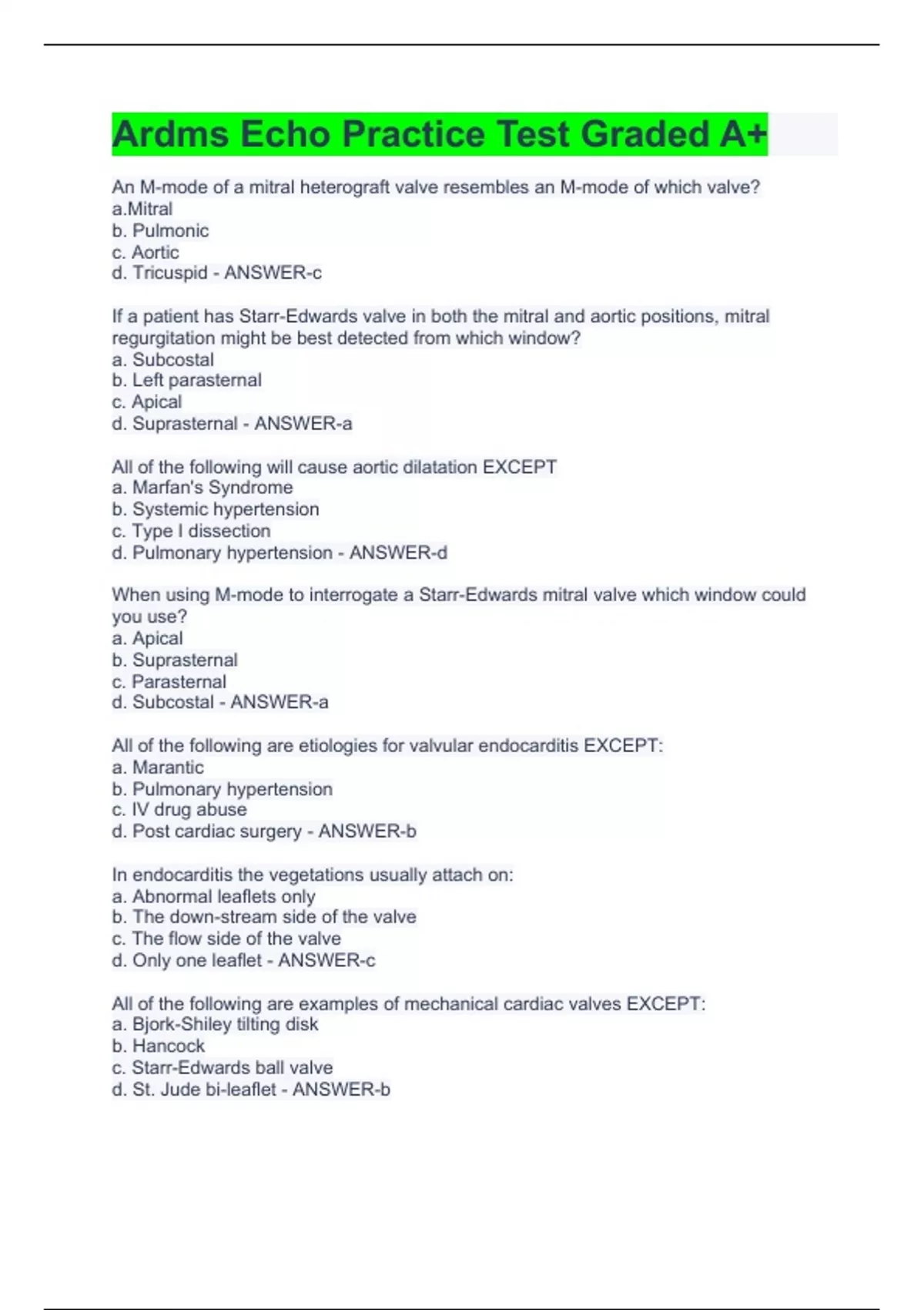 An M-mode of a mitral heterograft valve resembles an M-mode of which valve? a.Mitral b. Pulmonic c. Aortic d. Tricuspid - ANSWER-c If a patient has Starr-Edwards valve in both the mitral and aortic positions, mitral regurgitation might be best detected from which window? a. Subcostal b. Left parasternal c. Apical d. Suprasternal - ANSWER-a All of the following will cause aortic dilatation EXCEPT a. Marfan's Syndrome b. Systemic hypertension c. Type I dissection d. Pulmonary hypertension - ANSWER-d When using M-mode to interrogate a Starr-Edwards mitral valve which window could you use? a. Apical b. Suprasternal c. Parasternal d. Subcostal - ANSWER-a All of the following are etiologies for valvular endocarditis EXCEPT: a. Marantic b. Pulmonary hypertension c. IV drug abuse d. Post cardiac surgery - ANSWER-b In endocarditis the vegetations usually attach on: a. Abnormal leaflets only b. The down-stream side of the valve c. The flow side of the valve d. Only one leaflet - ANSWER-c All of the following are examples of mechanical cardiac valves EXCEPT: a. Bjork-Shiley tilting disk b. Hancock c. Starr-Edwards ball valve d. St. Jude bi-leaflet - ANSWER-b Patients with Marfan syndrome often die from: a. Endocarditis b. Aortic regurgitation c. Aortic dissection d. Mitral valve prolapse - ANSWER-c All of the following are different types of endocarditis except: a. Aosinophilic b. Marantic c. Dressler's d. Libman-Sachs - ANSWER-c When using Doppler to interrogate a Starr-Edwards mitral valve which window would you use? a. Parasternal b. Apical c. Subcostal d. Suprasternal - ANSWER-b Low risk patients for infective endocarditis include those with: a. Intravenous drug abuse b. Coronary artery disease c. Previous history of endocarditis d. Prosthetic mitral valve - ANSWER-b High risk patients for infective endocarditis include those with: a. Intravenous drug abuse b. High blood pressure c. High cholesterol d. Coronary artery disease - ANSWER-a In normal development which is the first to close? a. Ductus arteriosus b. Foramen ovale c. Ventricular septal defect d. Atrial septal defect - ANSWER-a To perform continuous wave Doppler using a PEDOFF probe how many Piezoelectric crystals are required? a.Two b. Sixty-four c. Four d. One hundred and twenty-eight One - ANSWER-a