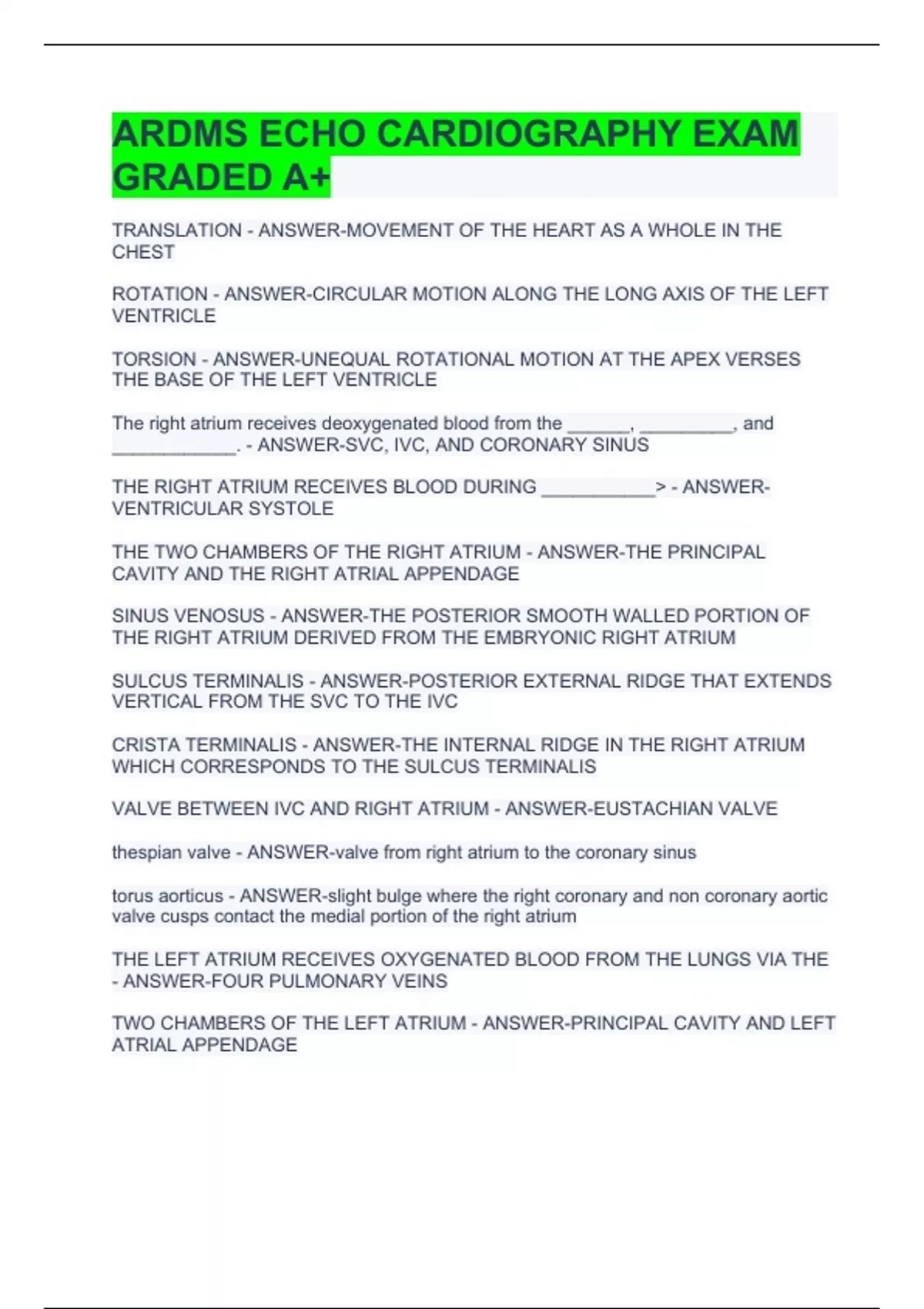 TRANSLATION - ANSWER-MOVEMENT OF THE HEART AS A WHOLE IN THE CHEST ROTATION - ANSWER-CIRCULAR MOTION ALONG THE LONG AXIS OF THE LEFT VENTRICLE TORSION - ANSWER-UNEQUAL ROTATIONAL MOTION AT THE APEX VERSES THE BASE OF THE LEFT VENTRICLE The right atrium receives deoxygenated blood from the ______, _________, and ____________. - ANSWER-SVC, IVC, AND CORONARY SINUS THE RIGHT ATRIUM RECEIVES BLOOD DURING ___________> - ANSWER-VENTRICULAR SYSTOLE THE TWO CHAMBERS OF THE RIGHT ATRIUM - ANSWER-THE PRINCIPAL CAVITY AND THE RIGHT ATRIAL APPENDAGE SINUS VENOSUS - ANSWER-THE POSTERIOR SMOOTH WALLED PORTION OF THE RIGHT ATRIUM DERIVED FROM THE EMBRYONIC RIGHT ATRIUM SULCUS TERMINALIS - ANSWER-POSTERIOR EXTERNAL RIDGE THAT EXTENDS VERTICAL FROM THE SVC TO THE IVC CRISTA TERMINALIS - ANSWER-THE INTERNAL RIDGE IN THE RIGHT ATRIUM WHICH CORRESPONDS TO THE SULCUS TERMINALIS VALVE BETWEEN IVC AND RIGHT ATRIUM - ANSWER-EUSTACHIAN VALVE thespian valve - ANSWER-valve from right atrium to the coronary sinus torus aorticus - ANSWER-slight bulge where the right coronary and non coronary aortic valve cusps contact the medial portion of the right atrium THE LEFT ATRIUM RECEIVES OXYGENATED BLOOD FROM THE LUNGS VIA THE - ANSWER-FOUR PULMONARY VEINS TWO CHAMBERS OF THE LEFT ATRIUM - ANSWER-PRINCIPAL CAVITY AND LEFT ATRIAL APPENDAGE LEFT ATRIUM RECEIVES BLOOD FROM THE PULMONARY VEINS DURING - ANSWER-VENTRICULAR SYSTOLE THE LEFT ATRIUM DELIVERS OXYGENATED BLOOD TO THE LEFT VENTRICLE DURING - ANSWER-VENTRICULAR DIASTOLE MUSCLE CONTAINED IN THE LEFT ATRIAL FREE WALL AND LEFT ATRIAL APPENDAGE - ANSWER-PECTINATE MUSCLE THE ESOPHAGUS IS LOCATED _______ TO THE LEFT ATRIUM - ANSWER-POSTERIOR THE AORTIC ROOT RESTS ON THE - ANSWER-ANTERIOR WALL OF THE LEFT ATRIUM DIVIDES THE RIGHT AND LEFT ATRIUM - ANSWER-INTERATRIAL SEPTUM THE CENTRAL PORTION OF THE INTERATRIAL SEPTUM IS CALLED THE ____ DURING FETAL LIFE AND _____ AFTER BIRTH - ANSWER-FORAMEN OVALE, FOSSA OVALIS IN ___ PERCENT OF ADULTS, THE FORAMEN OVALE NEVER SEALS COMPLETELY. - ANSWER-25% THE INNER WALL OF BOTH VENTRICLES ARE COMPOSED OF __________ - ANSWER-TRABECULAE CARNEAE, PAPILLARY MUSCLE, CHORDAE TENDINAE TRABECULAE CARNEAE - ANSWER-THICK MUSCLE BANDS LOCATED ALONG THE INNER WALLS OF THE VENTRICLES PAPILLARY MUSCLE - ANSWER-LOCATED BELOW THE ATRIOVENTRICULAR VALVES AND PROJECT FROM THE TRABECULAE CARNEAE CHORDAE TENDINEAE - ANSWER-STRONG FIBROUS CORDS THAT ORIGINATE FROM THE TIPS OF THE PAPILLARY MUSCLES AND ATTACH TO THE VALVES BLOOD FLOWS FROM THE RIGHT ATRIUM TO THE LUNGS VIA THE -------- - ANSWER-MAIN PULMONARY ARTERY THE CHAMBER THAT IS THE MOST ANTERIOR IS THE - ANSWER-RIGHT VENTRICLE THREE SECTIONS OF THE RIGHT VENTRICLE - ANSWER-INFLOW TRACT, APEX AND OUTFLOW TRACT