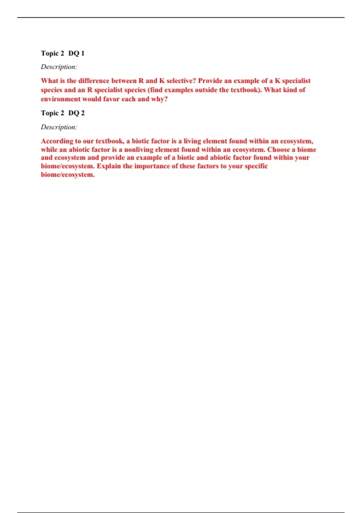 Topic 2 DQ 1 Description: What is the difference between R and K selective? Provide an example of a K specialist species and an R specialist species (find examples outside the textbook). What kind of environment would favor each and why? Topic 2 DQ 2 Description: According to our textbook, a biotic factor is a living element found within an ecosystem, while an abiotic factor is a nonliving element found within an ecosystem. Choose a biome and ecosystem and provide an example of a biotic and abiotic factor found within your biome/ecosystem. Explain the importance of these factors to your specific biome/ecosystem.