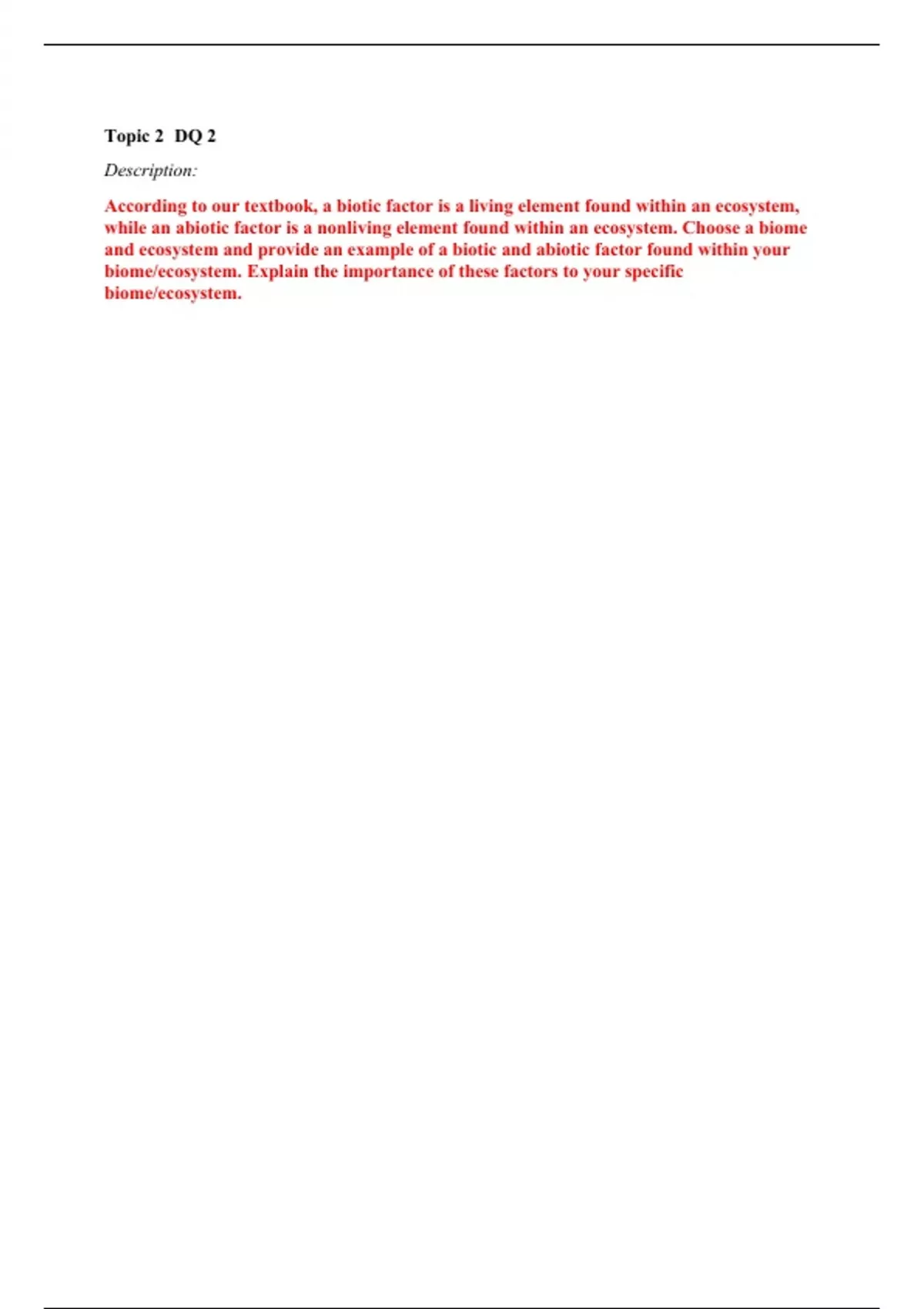 Topic 2 DQ 2 Description: According to our textbook, a biotic factor is a living element found within an ecosystem, while an abiotic factor is a nonliving element found within an ecosystem. Choose a biome and ecosystem and provide an example of a biotic and abiotic factor found within your biome/ecosystem. Explain the importance of these factors to your specific biome/ecosystem.