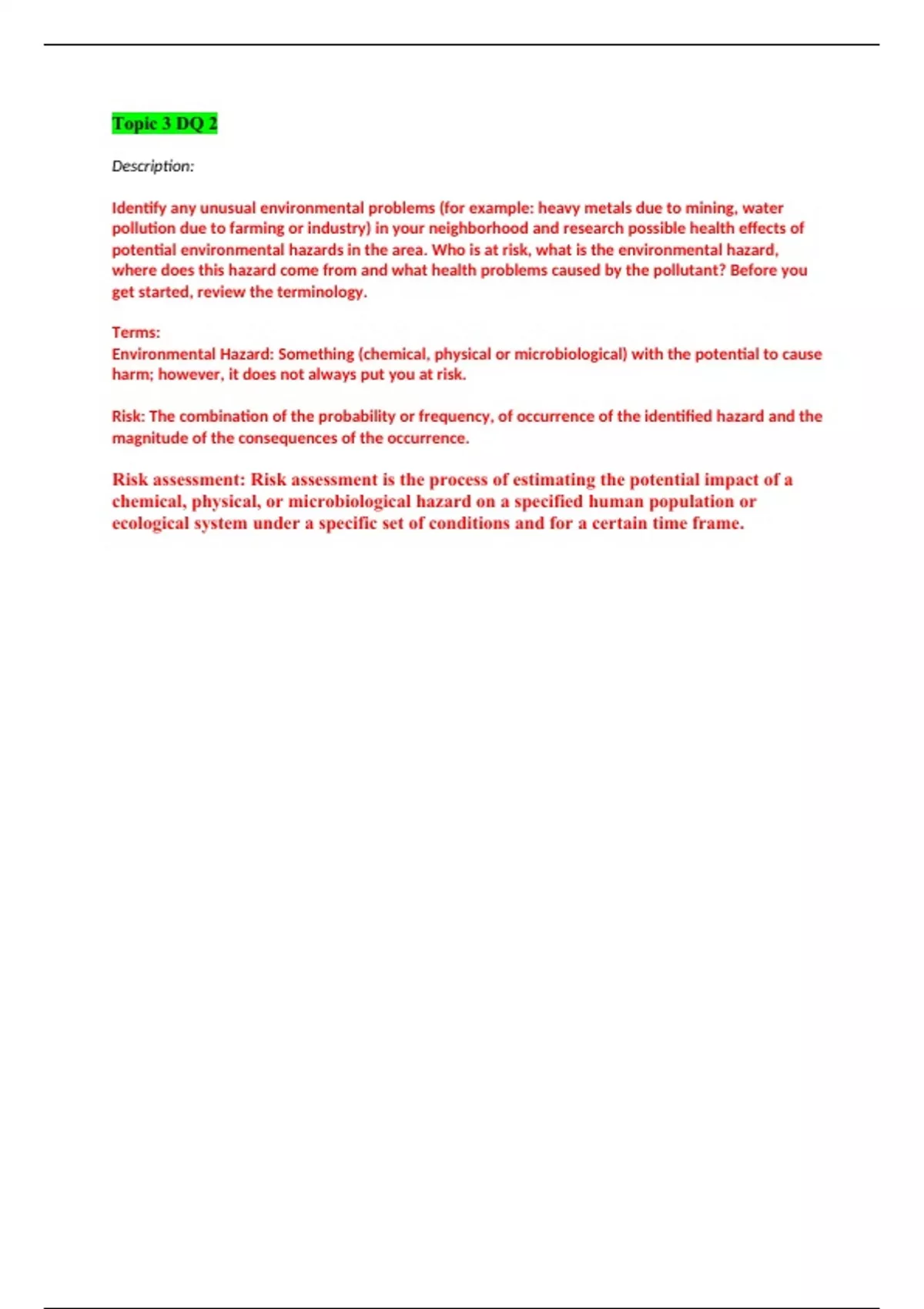 Topic 3 DQ 2 Description: Identify any unusual environmental problems (for example: heavy metals due to mining, water pollution due to farming or industry) in your neighborhood and research possible health effects of potential environmental hazards in the area. Who is at risk, what is the environmental hazard, where does this hazard come from and what health problems caused by the pollutant? Before you get started, review the terminology. Terms: Environmental Hazard: Something (chemical, physical or microbiological) with the potential to cause harm; however, it does not always put you at risk. Risk: The combination of the probability or frequency, of occurrence of the identified hazard and the magnitude of the consequences of the occurrence. Risk assessment: Risk assessment is the process of estimating the potential impact of a chemical, physical, or microbiological hazard on a specified human population or ecological system under a specific set of conditions and for a certain time frame.