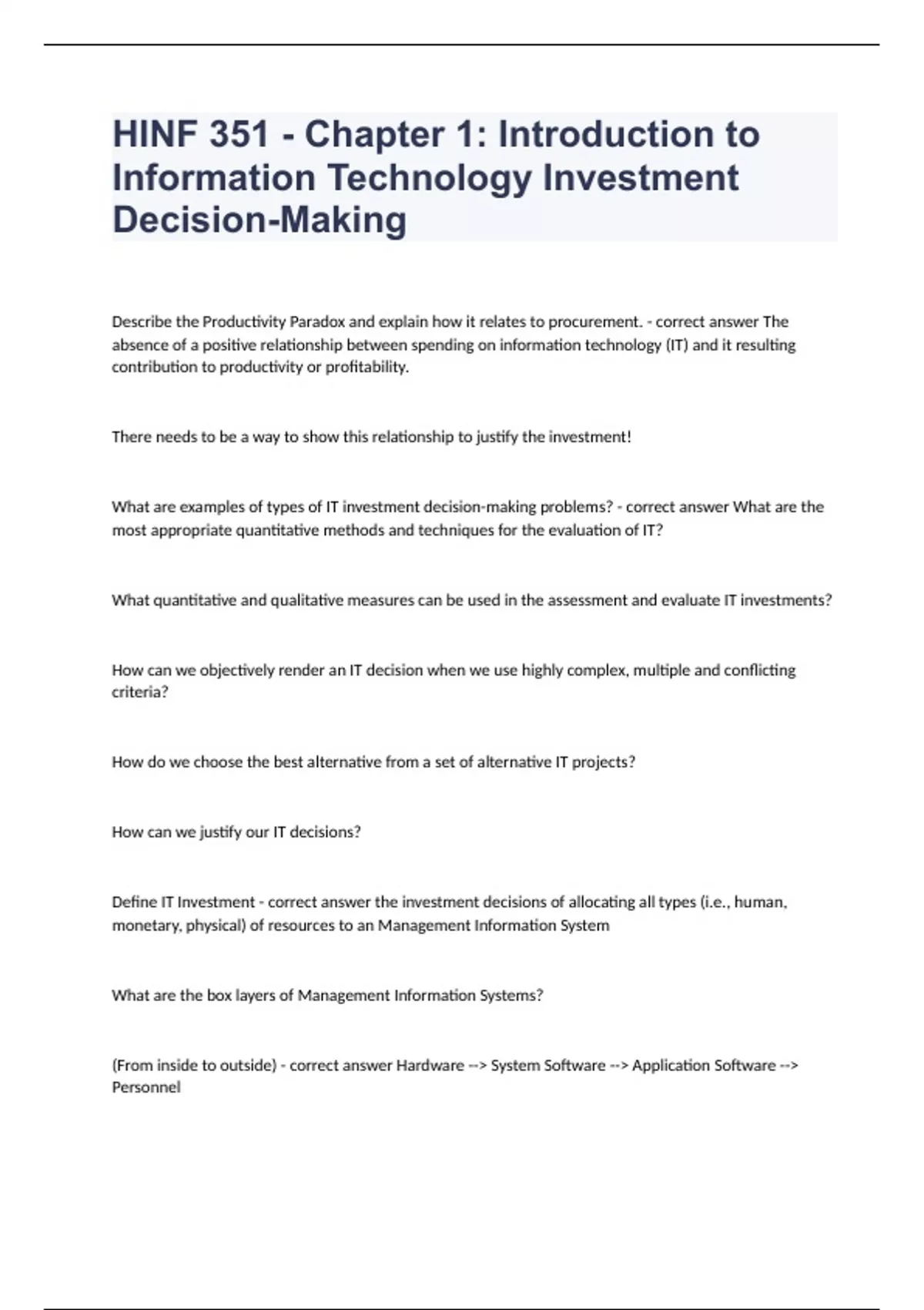 HINF 351 - Chapter 1 Introduction to Information Technology Investment Decision-Making fully solved