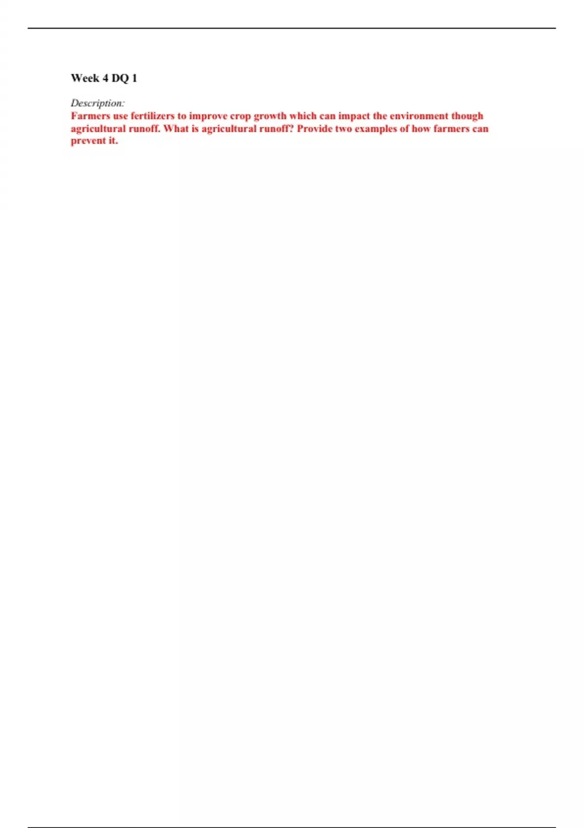 Week 4 DQ 1 Description: Farmers use fertilizers to improve crop growth which can impact the environment though agricultural runoff. What is agricultural runoff? Provide two examples of how farmers can prevent it.
