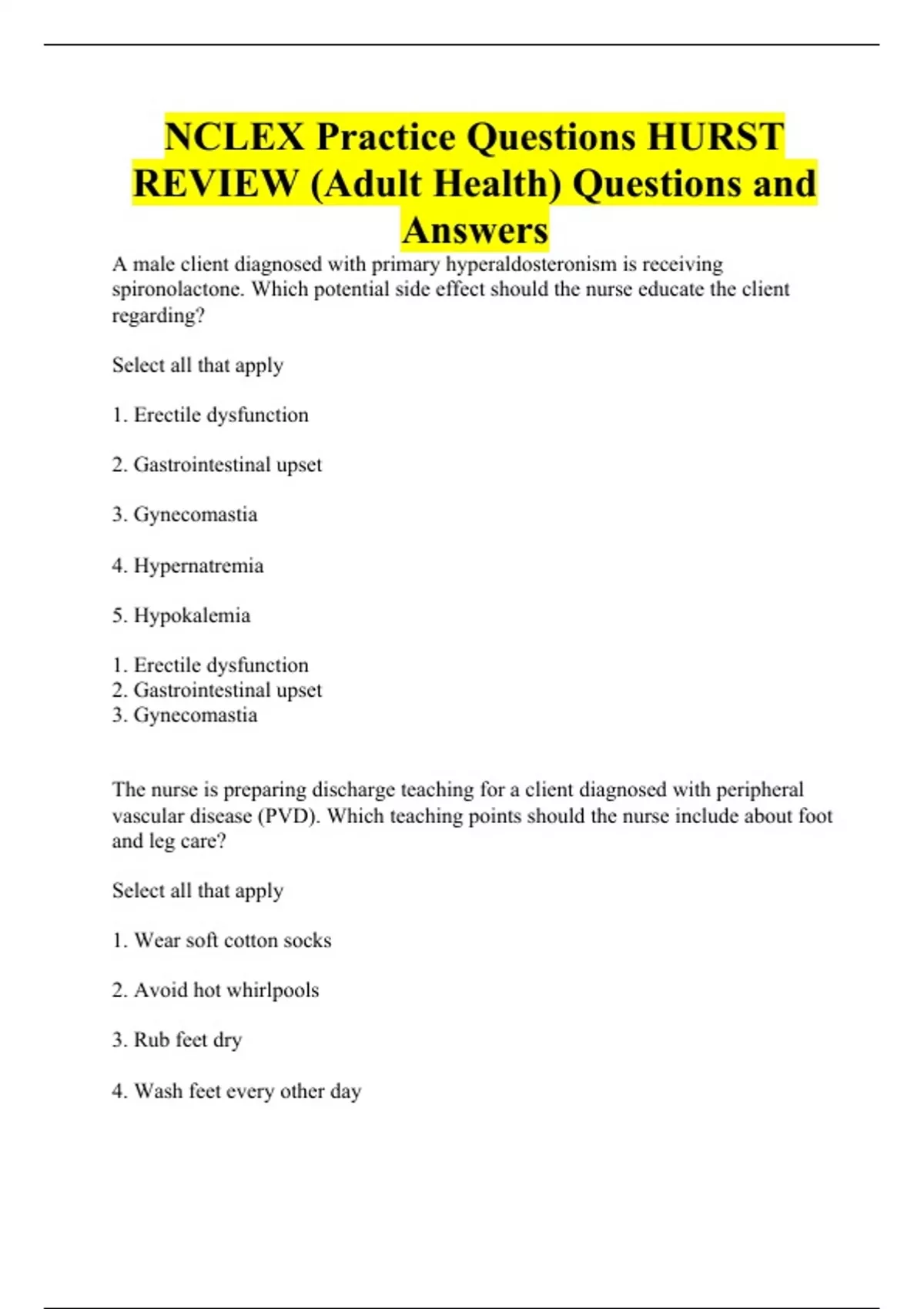 NCLEX Practice Questions HURST REVIEW (Adult Health) Questions and Answers
