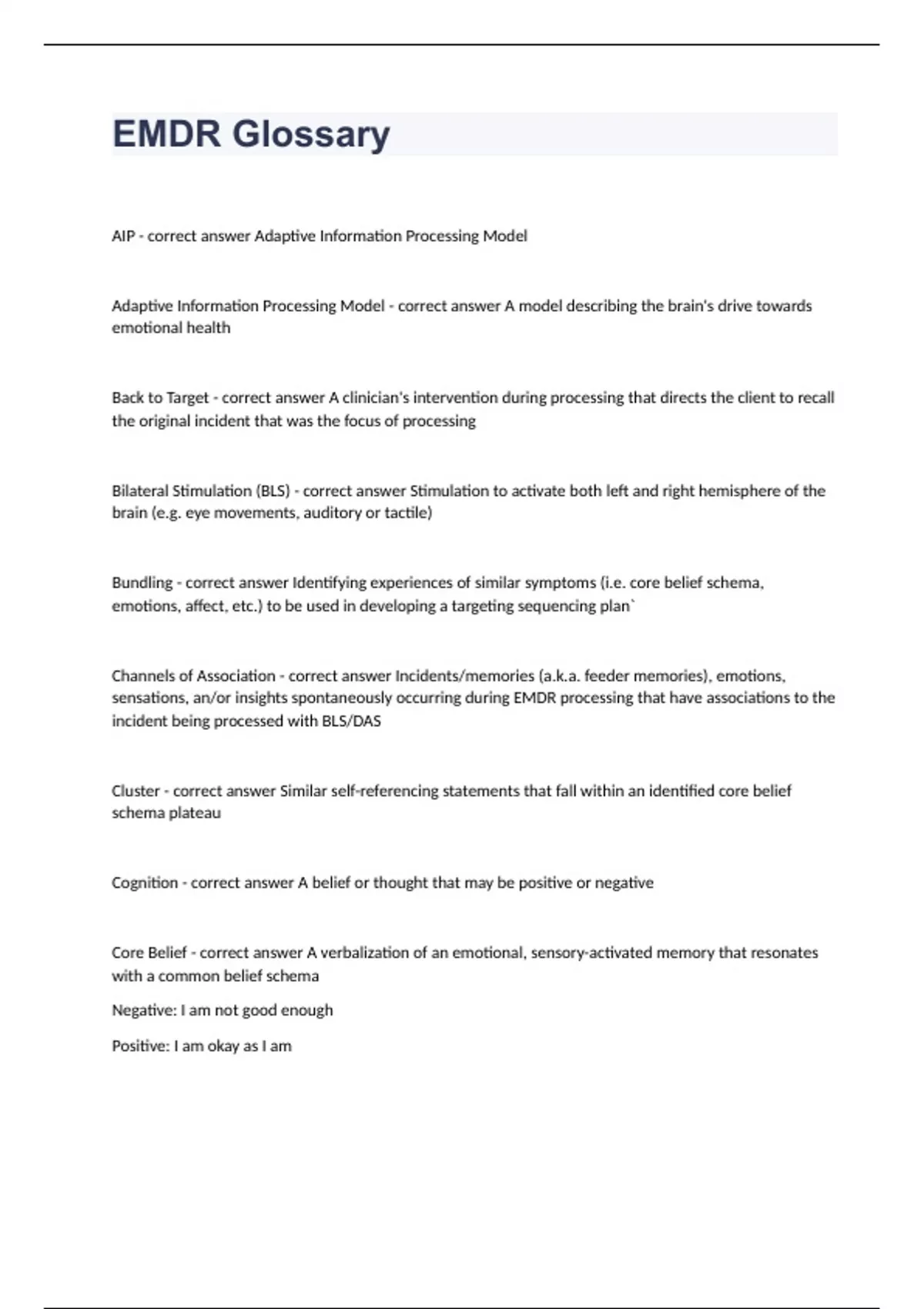 Exam of 5 pages for the course EMDR at EMDR (EMDR Glossary)
