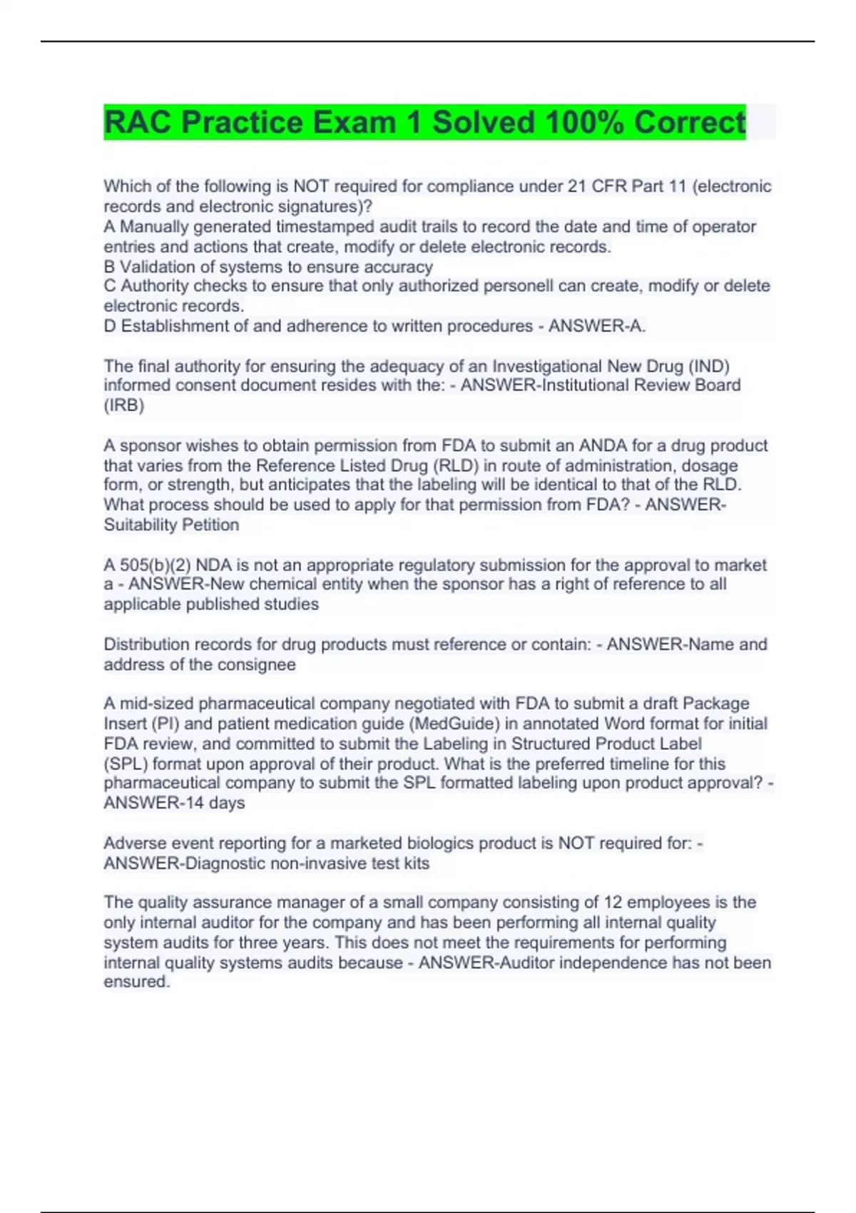 Which of the following is NOT required for compliance under 21 CFR Part 11 (electronic records and electronic signatures)? A Manually generated timestamped audit trails to record the date and time of operator entries and actions that create, modify or delete electronic records. B Validation of systems to ensure accuracy C Authority checks to ensure that only authorized personell can create, modify or delete electronic records. D Establishment of and adherence to written procedures - ANSWER-A. The final authority for ensuring the adequacy of an Investigational New Drug (IND) informed consent document resides with the: - ANSWER-Institutional Review Board (IRB) A sponsor wishes to obtain permission from FDA to submit an ANDA for a drug product that varies from the Reference Listed Drug (RLD) in route of administration, dosage form, or strength, but anticipates that the labeling will be identical to that of the RLD. What process should be used to apply for that permission from FDA? - ANSWER-Suitability Petition A 505(b)(2) NDA is not an appropriate regulatory submission for the approval to market a - ANSWER-New chemical entity when the sponsor has a right of reference to all applicable published studies Distribution records for drug products must reference or contain: - ANSWER-Name and address of the consignee A mid-sized pharmaceutical company negotiated with FDA to submit a draft Package Insert (PI) and patient medication guide (MedGuide) in annotated Word format for initial FDA review, and committed to submit the Labeling in Structured Product Label (SPL) format upon approval of their product. What is the preferred timeline for this pharmaceutical company to submit the SPL formatted labeling upon product approval? - ANSWER-14 days Adverse event reporting for a marketed biologics product is NOT required for: - ANSWER-Diagnostic non-invasive test kits The quality assurance manager of a small company consisting of 12 employees is the only internal auditor for the company and has been performing all internal quality system audits for three years. This does not meet the requirements for performing internal quality systems audits because - ANSWER-Auditor independence has not been ensured.