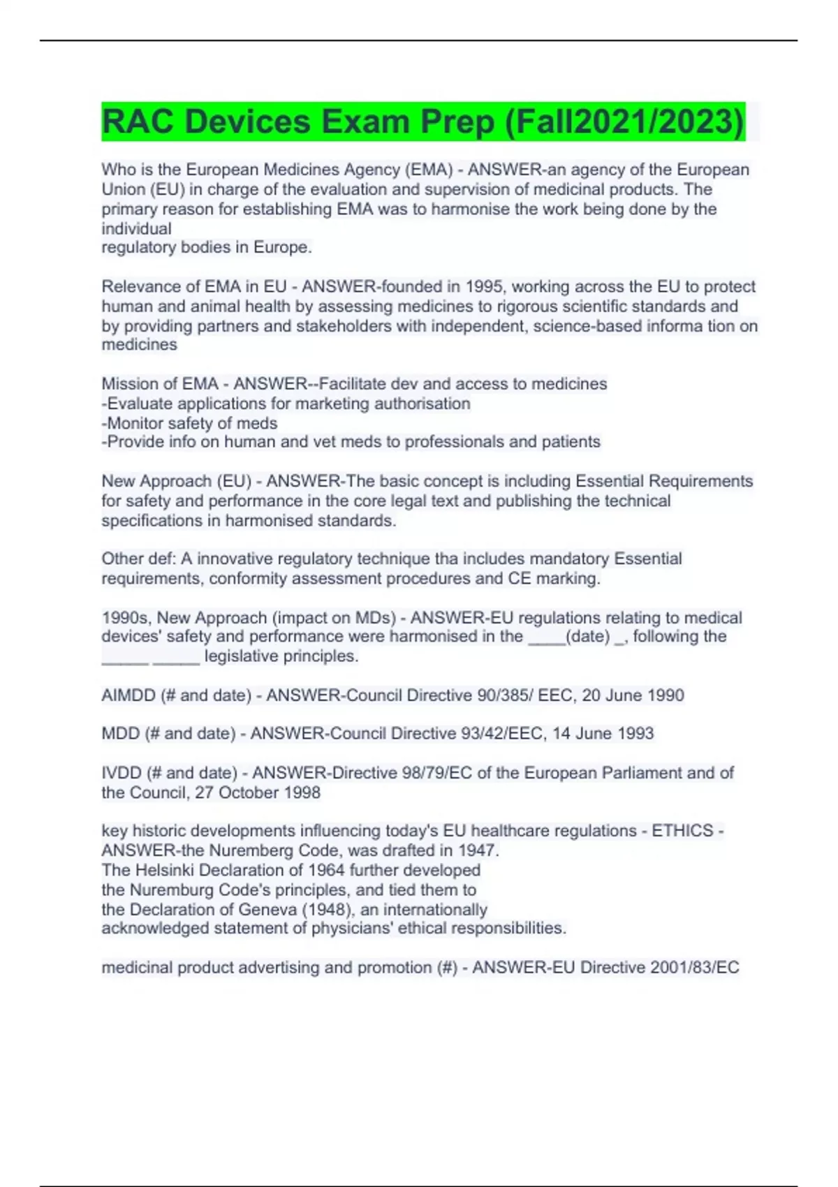 Who is the European Medicines Agency (EMA) - ANSWER-an agency of the European Union (EU) in charge of the evaluation and supervision of medicinal products. The primary reason for establishing EMA was to harmonise the work being done by the individual regulatory bodies in Europe. Relevance of EMA in EU - ANSWER-founded in 1995, working across the EU to protect human and animal health by assessing medicines to rigorous scientific standards and by providing partners and stakeholders with independent, science-based informa tion on medicines Mission of EMA - ANSWER--Facilitate dev and access to medicines -Evaluate applications for marketing authorisation -Monitor safety of meds -Provide info on human and vet meds to professionals and patients New Approach (EU) - ANSWER-The basic concept is including Essential Requirements for safety and performance in the core legal text and publishing the technical specifications in harmonised standards. Other def: A innovative regulatory technique tha includes mandatory Essential requirements, conformity assessment procedures and CE marking. 1990s, New Approach (impact on MDs) - ANSWER-EU regulations relating to medical devices' safety and performance were harmonised in the ____(date) _, following the _____ _____ legislative principles. AIMDD (# and date) - ANSWER-Council Directive 90/385/ EEC, 20 June 1990 MDD (# and date) - ANSWER-Council Directive 93/42/EEC, 14 June 1993 IVDD (# and date) - ANSWER-Directive 98/79/EC of the European Parliament and of the Council, 27 October 1998 key historic developments influencing today's EU healthcare regulations - ETHICS - ANSWER-the Nuremberg Code, was drafted in 1947. The Helsinki Declaration of 1964 further developed the Nuremburg Code's principles, and tied them to the Declaration of Geneva (1948), an internationally acknowledged statement of physicians' ethical responsibilities. medicinal product advertising and promotion (#) - ANSWER-EU Directive 2001/83/EC