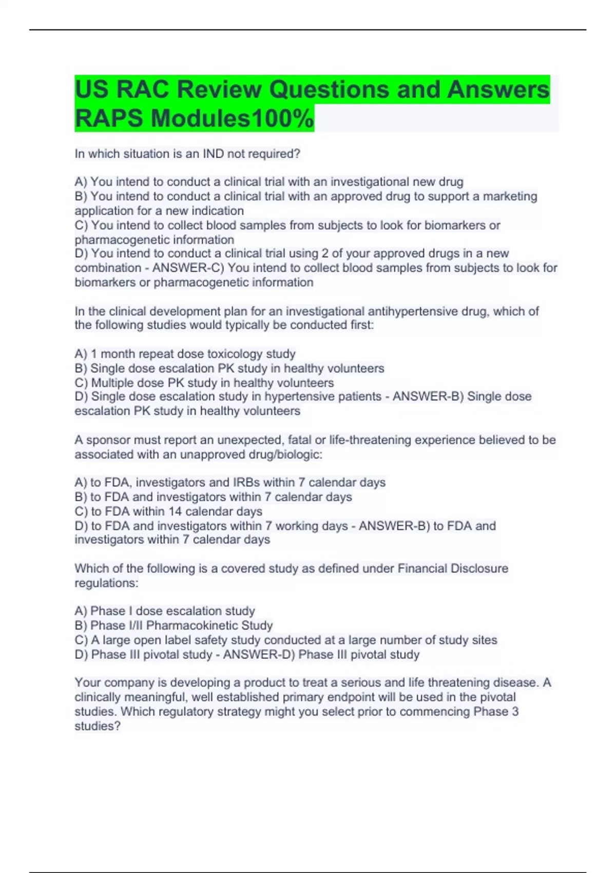 In which situation is an IND not required? A) You intend to conduct a clinical trial with an investigational new drug B) You intend to conduct a clinical trial with an approved drug to support a marketing application for a new indication C) You intend to collect blood samples from subjects to look for biomarkers or pharmacogenetic information D) You intend to conduct a clinical trial using 2 of your approved drugs in a new combination - ANSWER-C) You intend to collect blood samples from subjects to look for biomarkers or pharmacogenetic information In the clinical development plan for an investigational antihypertensive drug, which of the following studies would typically be conducted first: A) 1 month repeat dose toxicology study B) Single dose escalation PK study in healthy volunteers C) Multiple dose PK study in healthy volunteers D) Single dose escalation study in hypertensive patients - ANSWER-B) Single dose escalation PK study in healthy volunteers A sponsor must report an unexpected, fatal or life-threatening experience believed to be associated with an unapproved drug/biologic: A) to FDA, investigators and IRBs within 7 calendar days B) to FDA and investigators within 7 calendar days C) to FDA within 14 calendar days D) to FDA and investigators within 7 working days - ANSWER-B) to FDA and investigators within 7 calendar days Which of the following is a covered study as defined under Financial Disclosure regulations: A) Phase I dose escalation study B) Phase I/II Pharmacokinetic Study C) A large open label safety study conducted at a large number of study sites D) Phase III pivotal study - ANSWER-D) Phase III pivotal study Your company is developing a product to treat a serious and life threatening disease. A clinically meaningful, well established primary endpoint will be used in the pivotal studies. Which regulatory strategy might you select prior to commencing Phase 3 studies? A) Request Special Protocol Assessment B) Request Fast Track Designation C) Request Priority Review D) Approval under Subpart H, Accelerated Approval of New Drugs for Serious or Life Threatening Illnesses - ANSWER-A) Request Special Protocol Assessment As a regulatory affairs professional, you are responsible for developing the content of an information package for a Type B meeting with FDA. Your primary objective is to: A) Reach consensus on content from contributing team members B) Ensure content is sufficient to support meeting objective(s) and questions to FDA C) Provide appropriate preclinical summary D) Provide appropriate clinical summary - ANSWER-B) Ensure content is sufficient to support meeting objective(s) and questions to FDA You, a regulatory affairs professional, are assessing the information to be submitted in support of a marketing application for a new dosage form for a listed drug. You lack right of reference to one key preclinical report. Which type of application will you prepare for submission? A) 505 (b) (1) B) 505 (b) (2) C) 505 (j) D) PMA - ANSWER-B) 505 (b) (2) 8) If FDA were to invoke the Application Integrity Policy, which of the following is a possible outcome? A) Defer review of pending application(s) B) "File" a marketing application at the 60 day review C) Grant a waiver or deferral for pediatric clinical study D) Approve a marketing application - ANSWER-A) Defer review of pending application(s) 9) Which of the following supplements to an approved NDA/BLA must be approved by FDA prior to distributing product made using the change? A) Make change(s) to comply with USP B) Change in the technical grade of an excipient, same specifications and use C) Add a warning statement to prescribing information D) Process change outside the validated range - ANSWER-D) Process change outside the validated range 10) Which of the following products would not be regulated by CDER?