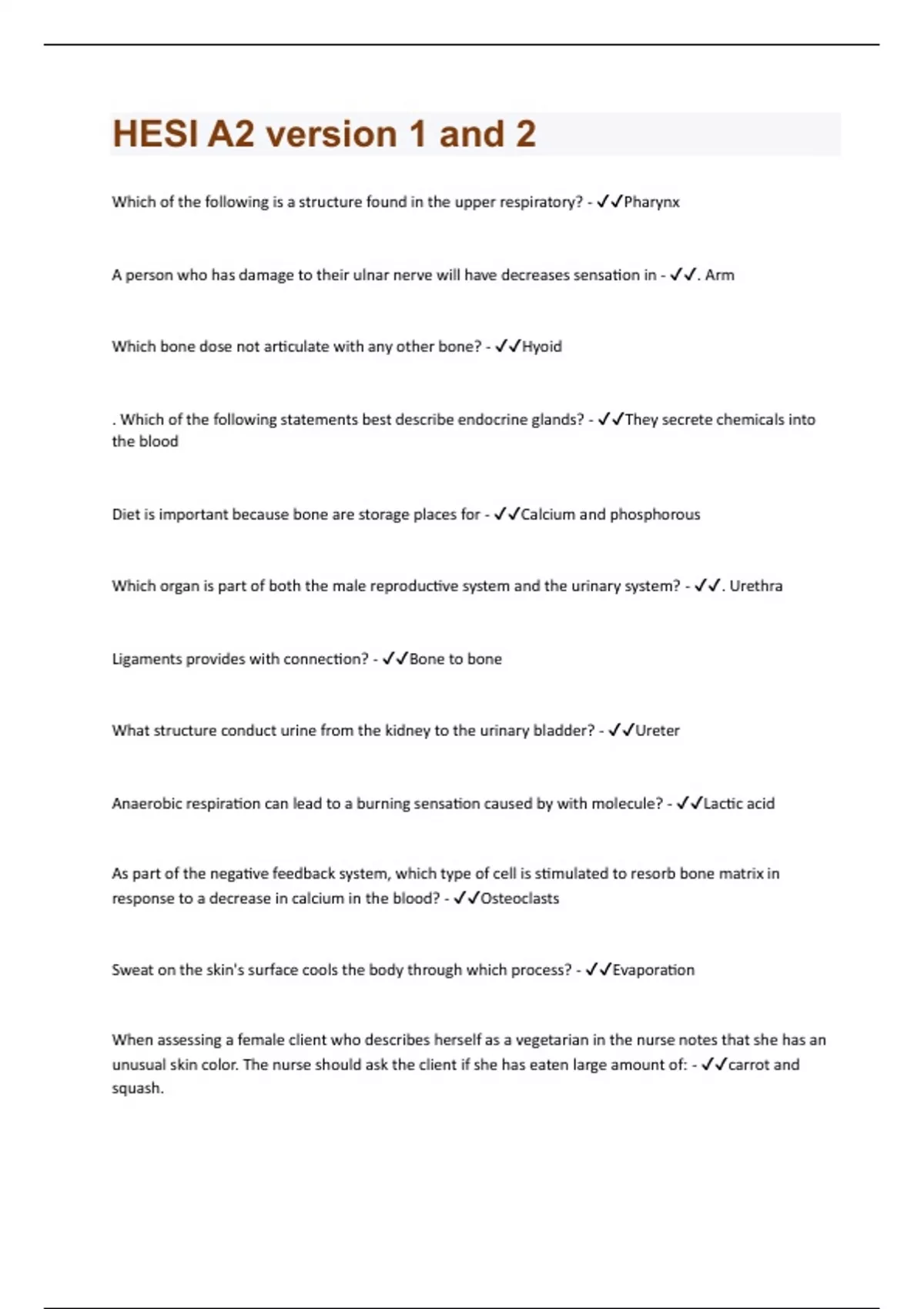 Which of the following is a structure found in the upper respiratory? - Pharynx A person who has damage to their ulnar nerve will have decreases sensation in - . Arm Which bone dose not articulate with any other bone? - Hyoid . Which of the following statements best describe endocrine glands? - They secrete chemicals into the blood Diet is important because bone are storage places for - Calcium and phosphorous Which organ is part of both the male reproductive system and the urinary system? - . Urethra Ligaments provides with connection? - Bone to bone What structure conduct urine from the kidney to the urinary bladder? - Ureter Anaerobic respiration can lead to a burning sensation caused by with molecule? - Lactic acid As part of the negative feedback system, which type of cell is stimulated to resorb bone matrix in response to a decrease in calcium in the blood? - Osteoclasts Sweat on the skin's surface cools the body through which process? - Evaporation When assessing a female client who describes herself as a vegetarian in the nurse notes that she has an unusual skin color. The nurse should ask the client if she has eaten large amount of: - carrot and squash.Which hand position describes an anatomical position of a person who is standing erect with feet forward? - Palms of the hand facing anterior Which structure is a ball and socket joint? - Shoulder
