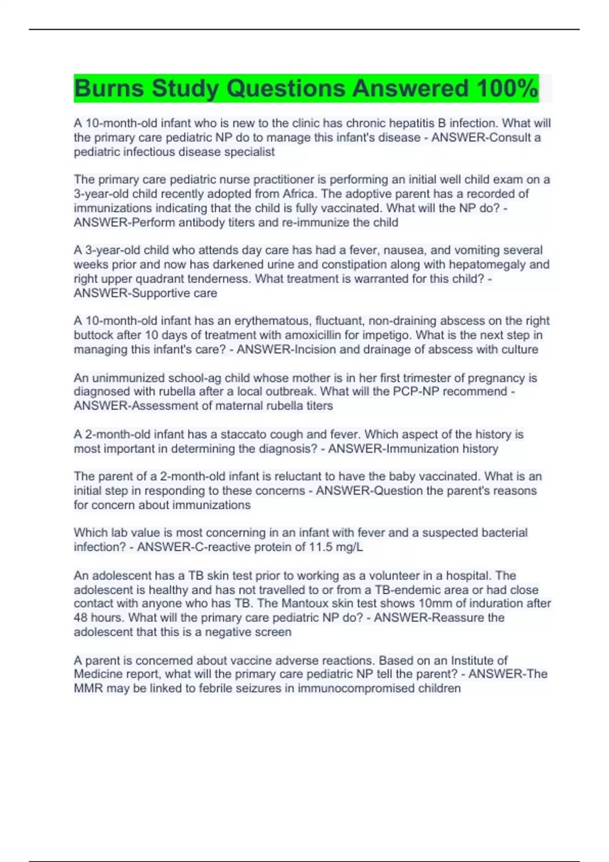 A 10-month-old infant who is new to the clinic has chronic hepatitis B infection. What will the primary care pediatric NP do to manage this infant's disease - ANSWER-Consult a pediatric infectious disease specialist The primary care pediatric nurse practitioner is performing an initial well child exam on a 3-year-old child recently adopted from Africa. The adoptive parent has a recorded of immunizations indicating that the child is fully vaccinated. What will the NP do? - ANSWER-Perform antibody titers and re-immunize the child A 3-year-old child who attends day care has had a fever, nausea, and vomiting several weeks prior and now has darkened urine and constipation along with hepatomegaly and right upper quadrant tenderness. What treatment is warranted for this child? - ANSWER-Supportive care A 10-month-old infant has an erythematous, fluctuant, non-draining abscess on the right buttock after 10 days of treatment with amoxicillin for impetigo. What is the next step in managing this infant's care? - ANSWER-Incision and drainage of abscess with culture An unimmunized school-ag child whose mother is in her first trimester of pregnancy is diagnosed with rubella after a local outbreak. What will the PCP-NP recommend - ANSWER-Assessment of maternal rubella titers A 2-month-old infant has a staccato cough and fever. Which aspect of the history is most important in determining the diagnosis? - ANSWER-Immunization history The parent of a 2-month-old infant is reluctant to have the baby vaccinated. What is an initial step in responding to these concerns - ANSWER-Question the parent's reasons for concern about immunizations Which lab value is most concerning in an infant with fever and a suspected bacterial infection? - ANSWER-C-reactive protein of 11.5 mg/L An adolescent has a TB skin test prior to working as a volunteer in a hospital. The adolescent is healthy and has not travelled to or from a TB-endemic area or had close contact with anyone who has TB. The Mantoux skin test shows 10mm of induration after 48 hours. What will the primary care pediatric NP do? - ANSWER-Reassure the adolescent that this is a negative screen A parent is concerned about vaccine adverse reactions. Based on an Institute of Medicine report, what will the primary care pediatric NP tell the parent? - ANSWER-The MMR may be linked to febrile seizures in immunocompromised children