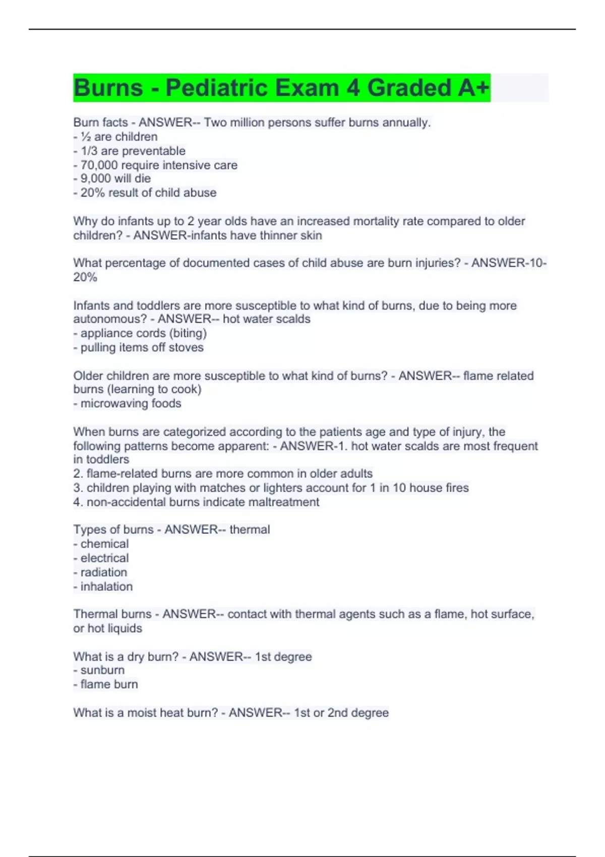Burn facts - ANSWER-- Two million persons suffer burns annually. - ½ are children - 1/3 are preventable - 70,000 require intensive care - 9,000 will die - 20% result of child abuse Why do infants up to 2 year olds have an increased mortality rate compared to older children? - ANSWER-infants have thinner skin What percentage of documented cases of child abuse are burn injuries? - ANSWER-10-20% Infants and toddlers are more susceptible to what kind of burns, due to being more autonomous? - ANSWER-- hot water scalds - appliance cords (biting) - pulling items off stoves Older children are more susceptible to what kind of burns? - ANSWER-- flame related burns (learning to cook) - microwaving foods When burns are categorized according to the patients age and type of injury, the following patterns become apparent: - ANSWER-1. hot water scalds are most frequent in toddlers 2. flame-related burns are more common in older adults 3. children playing with matches or lighters account for 1 in 10 house fires 4. non-accidental burns indicate maltreatment Types of burns - ANSWER-- thermal - chemical - electrical - radiation - inhalation Thermal burns - ANSWER-- contact with thermal agents such as a flame, hot surface, or hot liquids What is a dry burn? - ANSWER-- 1st degree - sunburn - flame burn What is a moist heat burn? - ANSWER-- 1st or 2nd degree