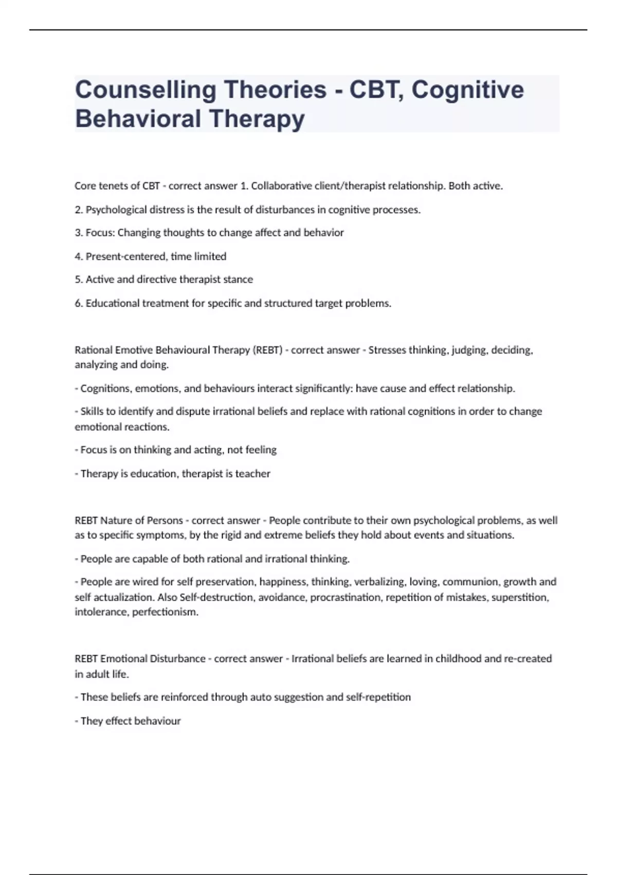 Counselling Theories - CBT, Cognitive Behavioural Therapy fully solved 2023