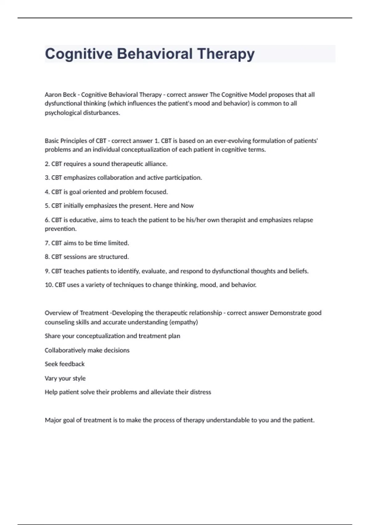 Cognitive Behavioral Therapy 2 questions well answered 2023