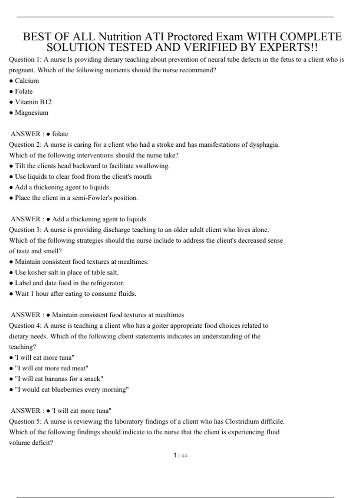 BEST OF ALL Nutrition ATI Proctored Exam WITH COMPLETE SOLUTION TESTED AND VERIFIED BY EXPERTS!! A nurse is providing discharge teaching to an older adult client who lives alone. Which of the following strategies should the nurse include to address the client's decreased sense of taste and smell? ● Maintain consistent food textures at mealtimes. ● Use kosher salt in place of table salt. ● Label and date food in the refrigerator. ● Wait 1 hour after eating to consume fluids. ANSWER : ● Maintain consistent food textures at mealtimes