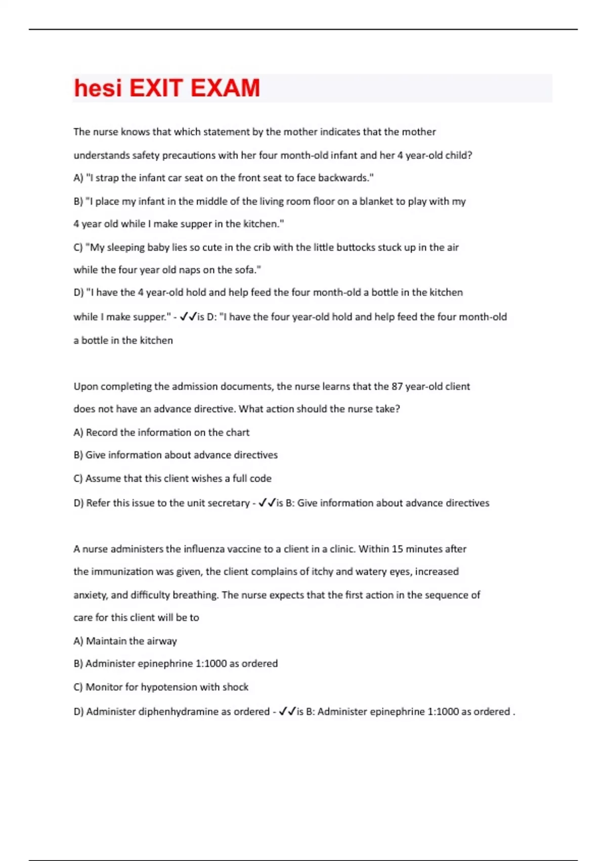 The nurse knows that which statement by the mother indicates that the mother understands safety precautions with her four month-old infant and her 4 year-old child? A) "I strap the infant car seat on the front seat to face backwards." B) "I place my infant in the middle of the living room floor on a blanket to play with my 4 year old while I make supper in the kitchen." C) "My sleeping baby lies so cute in the crib with the little buttocks stuck up in the air while the four year old naps on the sofa." D) "I have the 4 year-old hold and help feed the four month-old a bottle in the kitchen while I make supper." - is D: "I have the four year-old hold and help feed the four month-old a bottle in the kitchen Upon completing the admission documents, the nurse learns that the 87 year-old client does not have an advance directive. What action should the nurse take? A) Record the information on the chart B) Give information about advance directives C) Assume that this client wishes a full code D) Refer this issue to the unit secretary - is B: Give information about advance directives A nurse administers the influenza vaccine to a client in a clinic. Within 15 minutes after the immunization was given, the client complains of itchy and watery eyes, increased anxiety, and difficulty breathing. The nurse expects that the first action in the sequence of care for this client will be to A) Maintain the airway B) Administer epinephrine 1:1000 as ordered C) Monitor for hypotension with shock D) Administer diphenhydramine as ordered - is B: Administer epinephrine 1:1000 as ordered .Which of these children at the site of a disaster at a child day care center would the triage nurse put in the "treat last" category? A) An infant with intermittent bulging anterior fontanel between crying episodes B) A toddler with severe deep abrasions over 98% of the body C) A preschooler with 1 lower leg fracture and the other leg with an upper leg fracture D) A school-age child with singed eyebrows and hair on the arms - is B: A toddler with severe deep abrasions over 98% of the body . When admitting a client to an acute care facility, an identification bracelet is sent up with the admission form. In the event these do not match, the nurse's best action is to A) Change whichever item is incorrect to the correct information B) Use the bracelet and admission form until a replacement is supplied C) Notify the admissions office and wait to apply the bracelet D) Make a corrected identification bracelet for the client - is C: notify the admissions office and wait to apply the bracelet