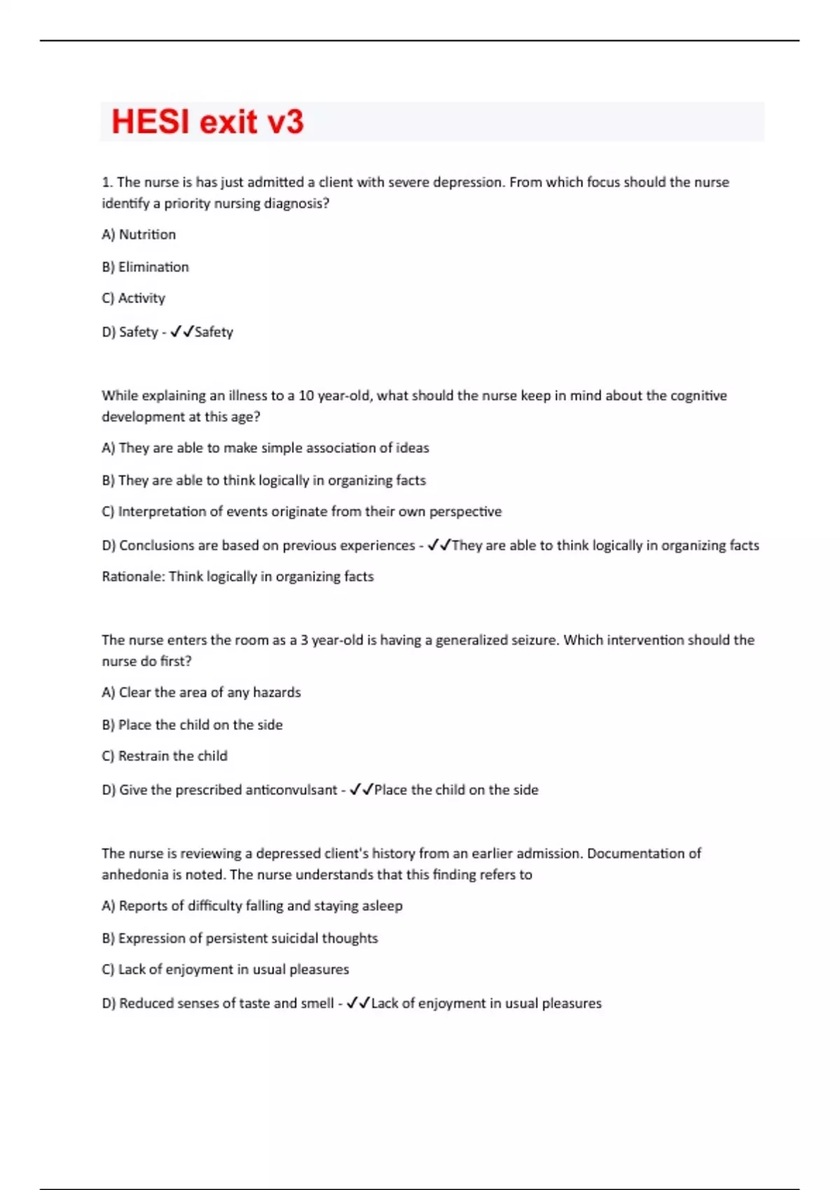 1. The nurse is has just admitted a client with severe depression. From which focus should the nurse identify a priority nursing diagnosis? A) Nutrition B) Elimination C) Activity D) Safety - Safety While explaining an illness to a 10 year-old, what should the nurse keep in mind about the cognitive development at this age? A) They are able to make simple association of ideas B) They are able to think logically in organizing facts C) Interpretation of events originate from their own perspective D) Conclusions are based on previous experiences - They are able to think logically in organizing facts Rationale: Think logically in organizing facts The nurse enters the room as a 3 year-old is having a generalized seizure. Which intervention should the nurse do first? A) Clear the area of any hazards B) Place the child on the side C) Restrain the child D) Give the prescribed anticonvulsant - Place the child on the side The nurse is reviewing a depressed client's history from an earlier admission. Documentation of anhedonia is noted. The nurse understands that this finding refers to A) Reports of difficulty falling and staying asleep B) Expression of persistent suicidal thoughts C) Lack of enjoyment in usual pleasures D) Reduced senses of taste and smell - Lack of enjoyment in usual pleasures. A client has just returned to the medical-s
