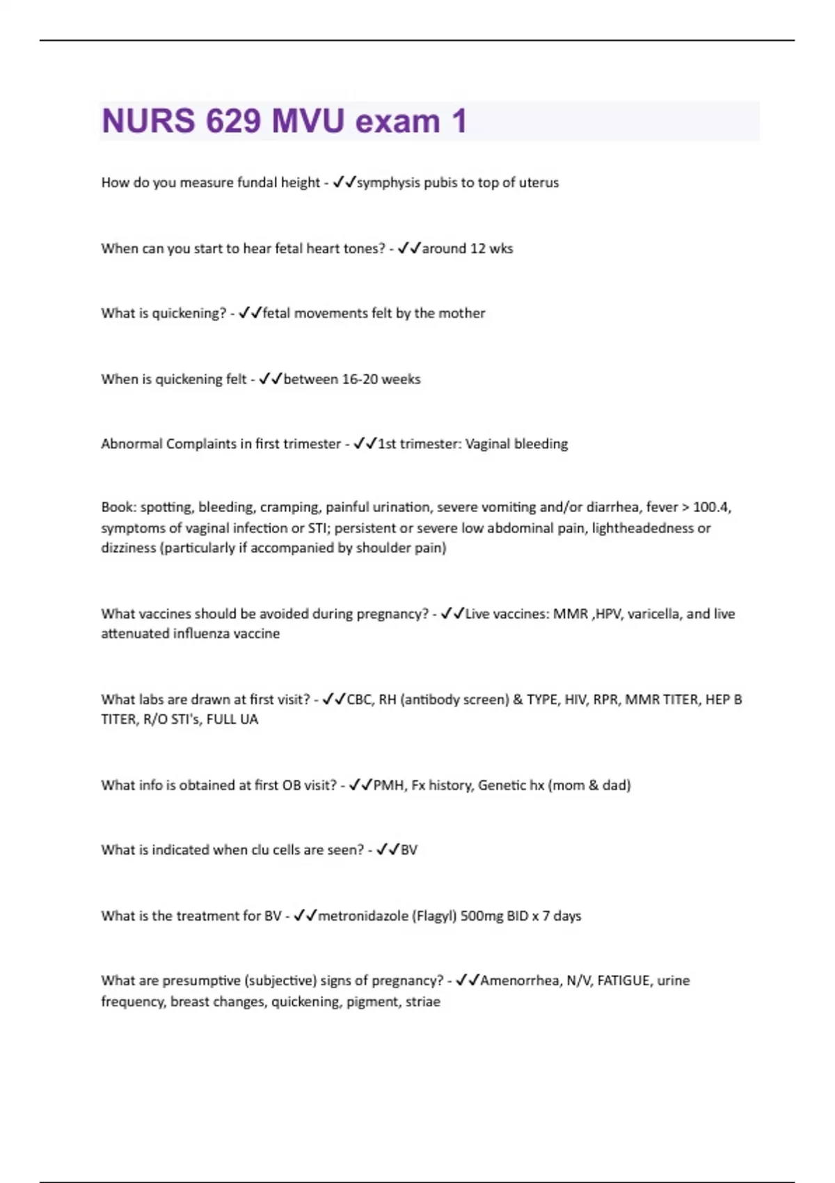 How do you measure fundal height - symphysis pubis to top of uterus When can you start to hear fetal heart tones? - around 12 wks What is quickening? - fetal movements felt by the mother When is quickening felt - between 16-20 weeks Abnormal Complaints in first trimester - 1st trimester: Vaginal bleeding Book: spotting, bleeding, cramping, painful urination, severe vomiting and/or diarrhea, fever > 100.4, symptoms of vaginal infection or STI; persistent or severe low abdominal pain, lightheadedness or dizziness (particularly if accompanied by shoulder pain) What vaccines should be avoided during pregnancy? - Live vaccines: MMR ,HPV, varicella, and live attenuated influenza vaccine What labs are drawn at first visit? - CBC, RH (antibody screen) & TYPE, HIV, RPR, MMR TITER, HEP B TITER, R/O STI's, FULL UA What info is obtained at first OB visit? - PMH, Fx history, Genetic hx (mom & dad) What is indicated when clu cells are seen? - BV What is the treatment for BV - metronidazole (Flagyl) 500mg BID x 7 days What are presumptive (subjective) signs of pregnancy? - Amenorrhea, N/V, FATIGUE, urine frequency, breast changes, quickening, pigment, striae