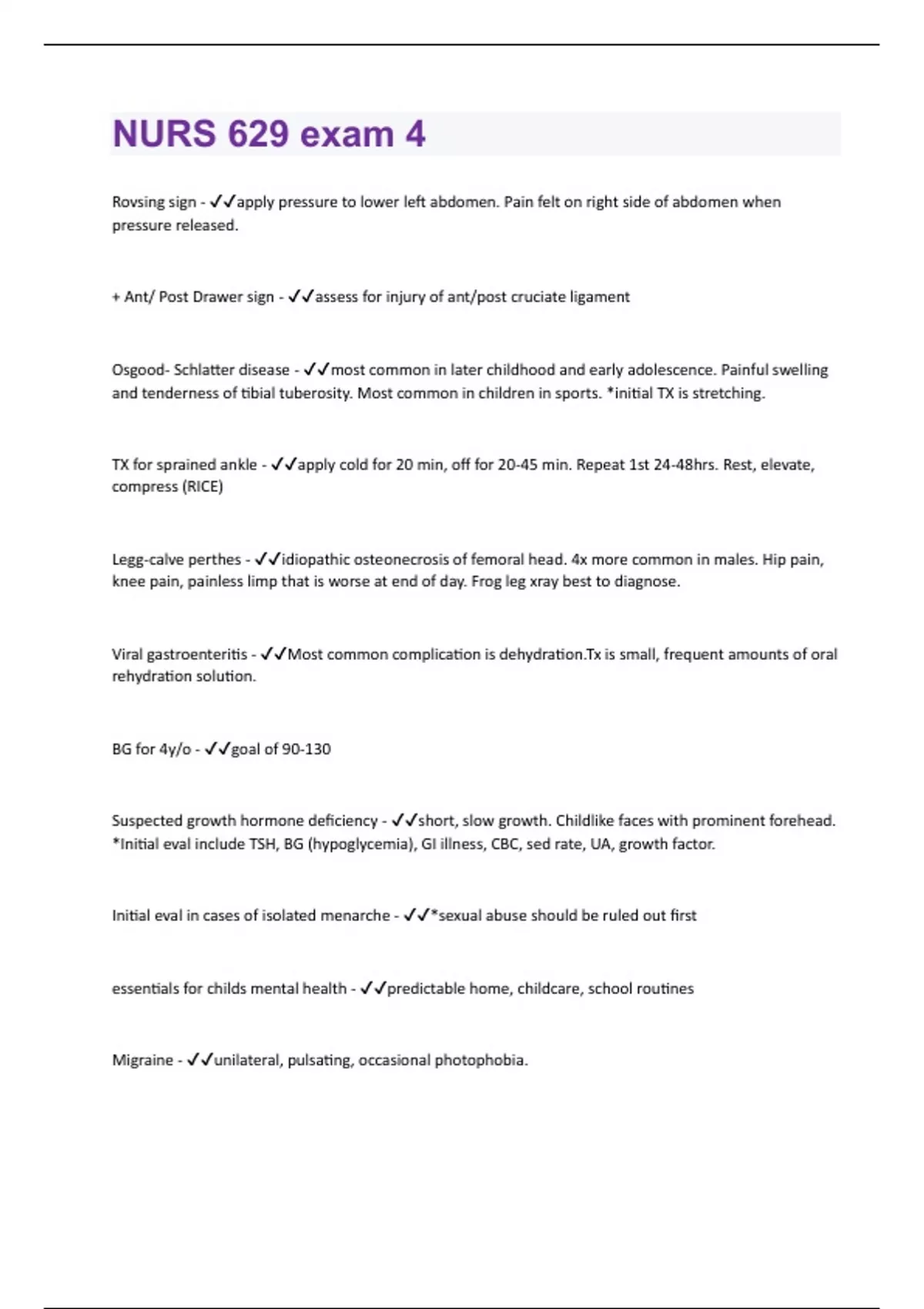 Rovsing sign - apply pressure to lower left abdomen. Pain felt on right side of abdomen when pressure released. + Ant/ Post Drawer sign - assess for injury of ant/post cruciate ligament Osgood- Schlatter disease - most common in later childhood and early adolescence. Painful swelling and tenderness of tibial tuberosity. Most common in children in sports. *initial TX is stretching. TX for sprained ankle - apply cold for 20 min, off for 20-45 min. Repeat 1st 24-48hrs. Rest, elevate, compress (RICE) Legg-calve perthes - idiopathic osteonecrosis of femoral head. 4x more common in males. Hip pain, knee pain, painless limp that is worse at end of day. Frog leg xray best to diagnose. Viral gastroenteritis - Most common complication is dehydration.Tx is small, frequent amounts of oral rehydration solution. BG for 4y/o - goal of 90-130 Suspected growth hormone deficiency - short, slow growth. Childlike faces with prominent forehead. *Initial eval include TSH, BG (hypoglycemia), GI illness, CBC, sed rate, UA, growth factor. Initial eval in cases of isolated menarche - *sexual abuse should be ruled out first essentials for childs mental health - predictable home, childcare, school routines Migraine - unilateral, pulsating, occasional photophobia