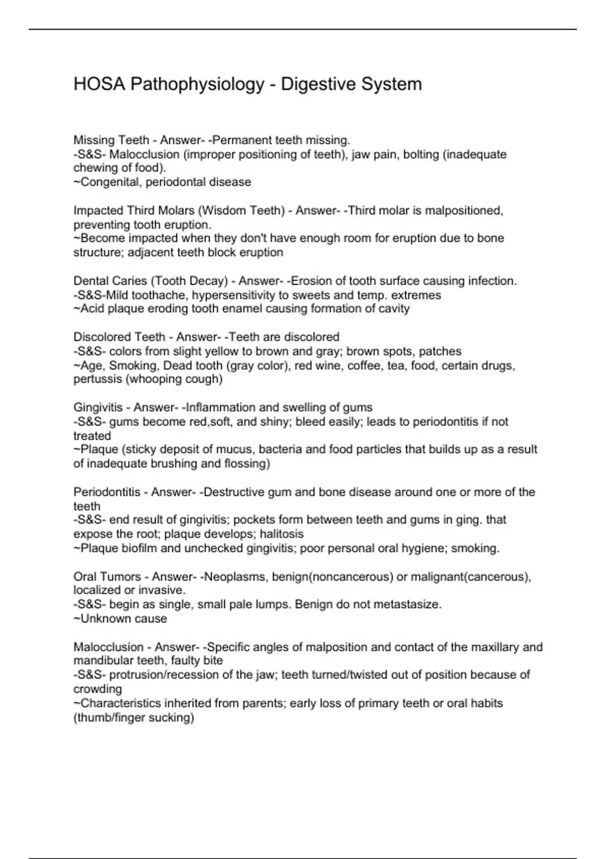 Missing Teeth - Answer- -Permanent teeth missing. -S&S- Malocclusion (improper positioning of teeth), jaw pain, bolting (inadequate chewing of food). ~Congenital, periodontal disease Impacted Third Molars (Wisdom Teeth) - Answer- -Third molar is malpositioned, preventing tooth eruption. ~Become impacted when they don't have enough room for eruption due to bone structure; adjacent teeth block eruption Dental Caries (Tooth Decay) - Answer- -Erosion of tooth surface causing infection. -S&S-Mild toothache, hypersensitivity to sweets and temp. extremes ~Acid plaque eroding tooth enamel causing formation of cavity Discolored Teeth - Answer- -Teeth are discolored -S&S- colors from slight yellow to brown and gray; brown spots, patches ~Age, Smoking, Dead tooth (gray color), red wine, coffee, tea, food, certain drugs, pertussis (whooping cough) Gingivitis - Answer- -Inflammation and swelling of gums -S&S- gums become red,soft, and shiny; bleed easily; leads to periodontitis if not treated ~Plaque (sticky deposit of mucus, bacteria and food particles that builds up as a result of inadequate brushing and flossing) Periodontitis - Answer- -Destructive gum and bone disease around one or more of the teeth -S&S- end result of gingivitis; pockets form between teeth and gums in ging. that expose the root; plaque develops; halitosis ~Plaque biofilm and unchecked gingivitis; poor personal oral hygiene; smoking. Oral Tumors - Answer- -Neoplasms, benign(noncancerous) or malignant(cancerous), localized or invasive. -S&S- begin as single, small pale lumps. Benign do not metastasize. ~Unknown cause Malocclusion - Answer- -Specific angles of malposition and contact of the maxillary and mandibular teeth, faulty bite -S&S- protrusion/recession of the jaw; teeth turned/twisted out of position because of crowding ~Cha