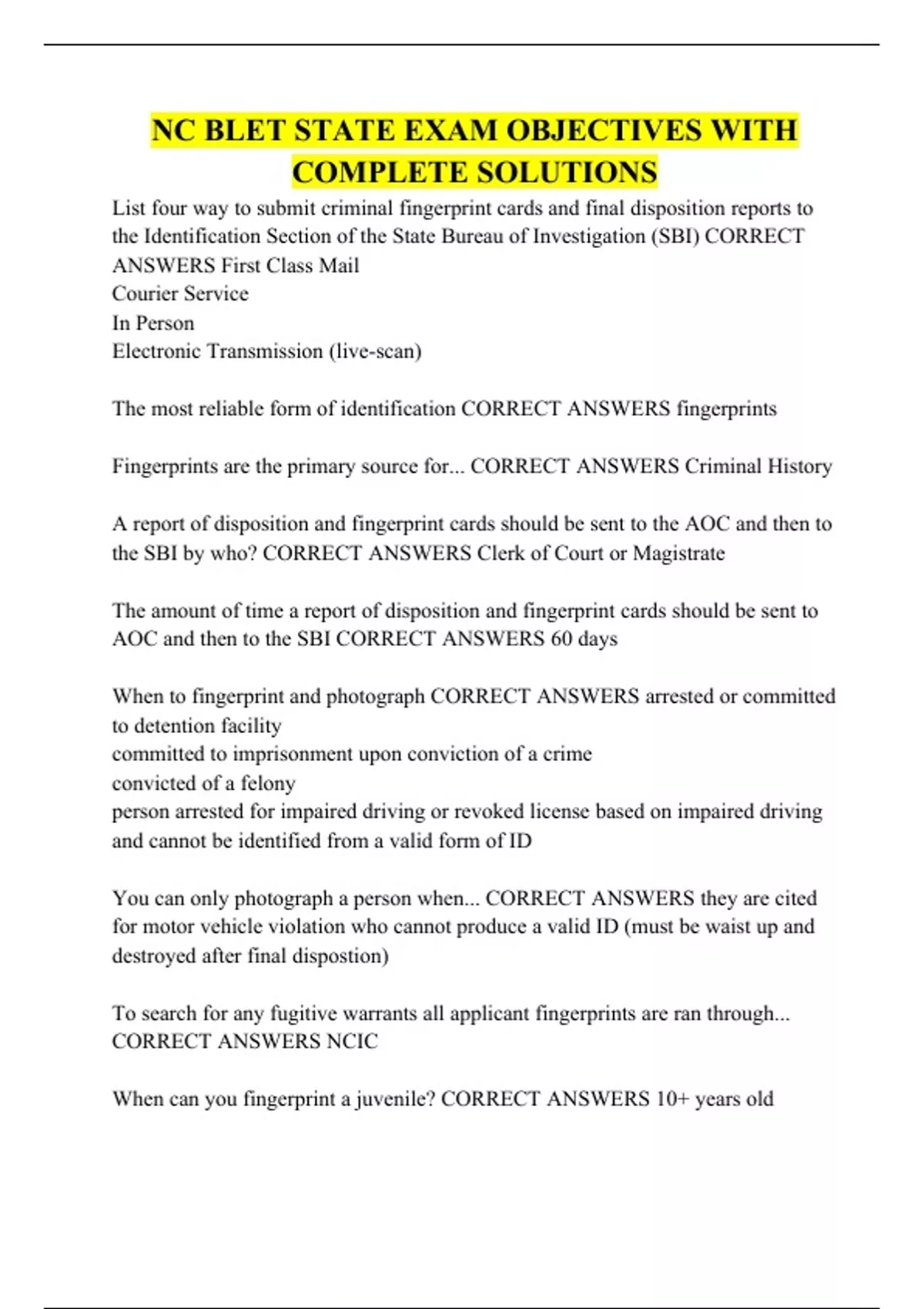 NC BLET STATE EXAM OBJECTIVES WITH COMPLETE SOLUTIONS