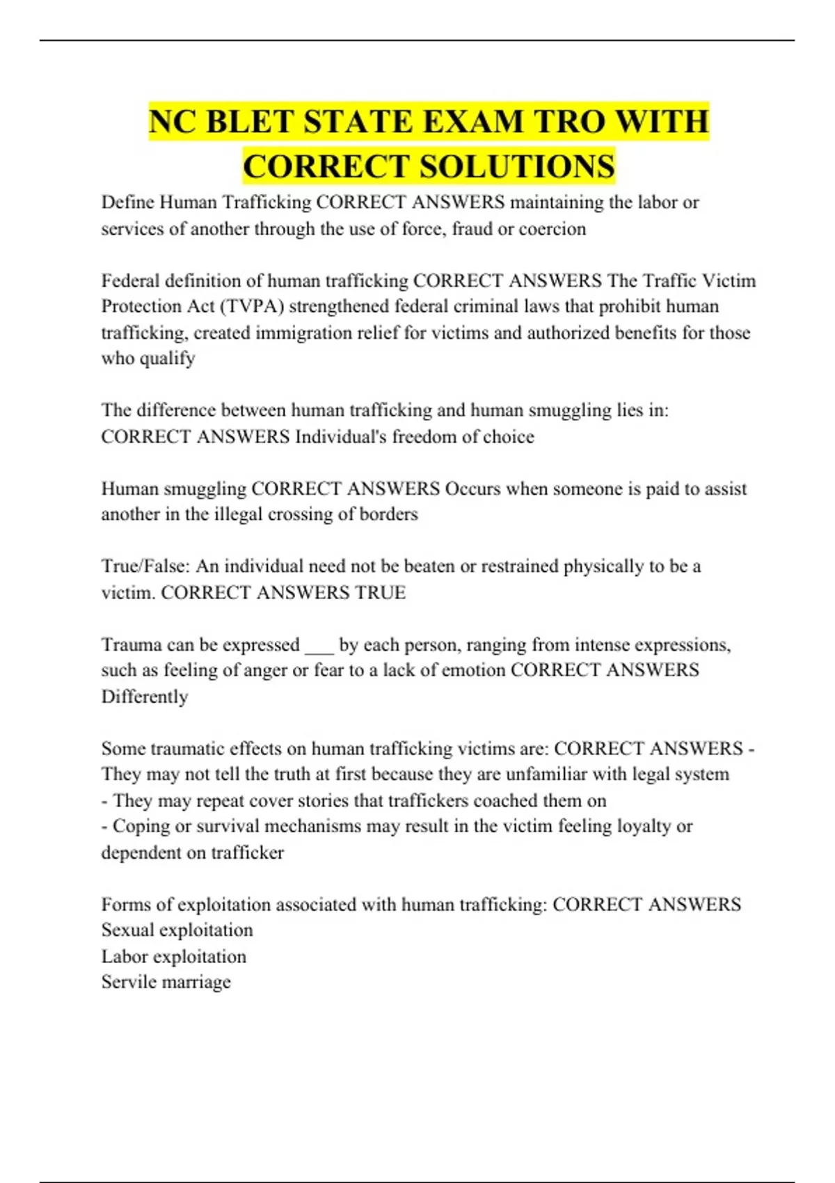 NC BLET STATE EXAM TRO WITH CORRECT SOLUTIONS
