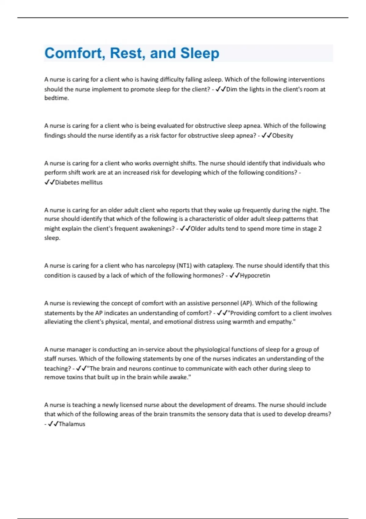 A nurse is caring for a client who is having difficulty falling asleep. Which of the following interventions should the nurse implement to promote sleep for the client? - Dim the lights in the client's room at bedtime. A nurse is caring for a client who is being evaluated for obstructive sleep apnea. Which of the following findings should the nurse identify as a risk factor for obstructive sleep apnea? - Obesity A nurse is caring for a client who works overnight shifts. The nurse should identify that individuals who perform shift work are at an increased risk for developing which of the following conditions? - Diabetes mellitus A nurse is caring for an older adult client who reports that they wake up frequently during the night. The nurse should identify that which of the following is a characteristic of older adult sleep patterns that might explain the client's frequent awakenings? - Older adults tend to spend more time in stage 2 sleep. A nurse is caring for a client who has narcolepsy (NT1) with cataplexy. The nurse should identify that this condition is caused by a lack of which of the following hormones? - Hypocretin A nurse is reviewing the concept of comfort with an assistive personnel (AP). Which of the following statements by the AP indicates an understanding of comfort? - "Providing comfort to a client involves alleviating the client's physical, mental, and emotional distress using warmth and empathy." A nurse manager is conducting an in-service about the physiological functions of sleep for a group of staff nurses. Which of the following statements by one of the nurses indicates an understanding of the teaching? - "The brain and neurons continue to communicate with each other during sleep to remove toxins that built up in the brain while awake." A nurse is teaching a newly licensed nurse about the development of dreams. The nurse should include that which of the following areas of the brain transmits the sensory data that is used to develop dreams? - ThalamusA nurse is caring for an older adult client who is having difficulty sleeping and has a new prescription for a medication to help them sleep. Which of the following medications should the nurse identify as a firstline sleep aid for older adults? - Controlled-release melatonin