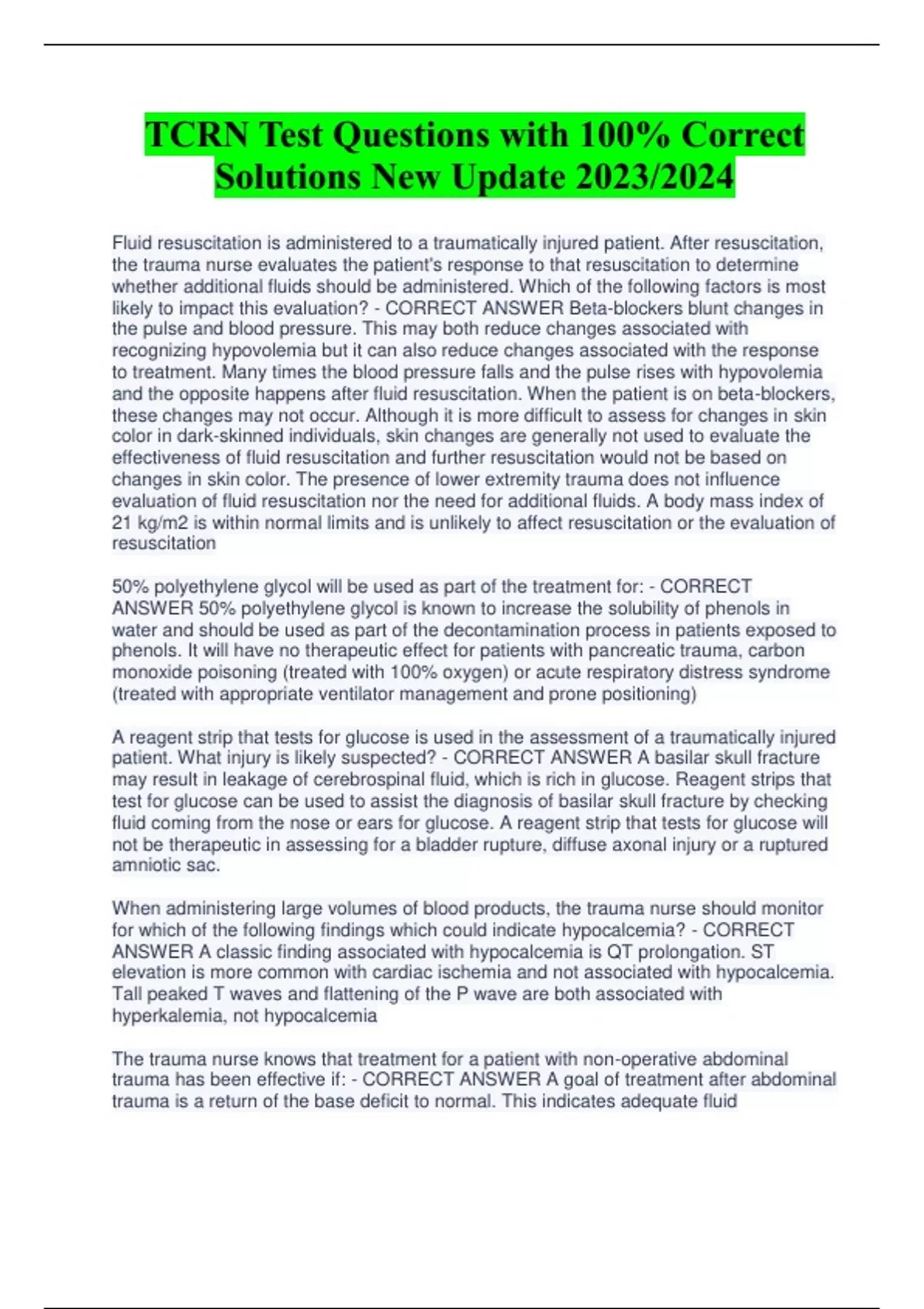 TCRN Test Questions with 100% Correct Solutions New Update 2023/2024 Fluid resuscitation is administered to a traumatically injured patient. After resuscitation, the trauma nurse evaluates the patient's response to that resuscitation to determine whether additional fluids should be administered. Which of the following factors is most likely to impact this evaluation? - CORRECT ANSWER Beta-blockers blunt changes in the pulse and blood pressure. This may both reduce changes associated with recognizing hypovolemia but it can also reduce changes associated with the response to treatment. Many times the blood pressure falls and the pulse rises with hypovolemia and the opposite happens after fluid resuscitation. When the patient is on beta-blockers, these changes may not occur. Although it is more difficult to assess for changes in skin color in dark-skinned individuals, skin changes are generally not used to evaluate the effectiveness of fluid resuscitation and further resuscitation would not be based on changes in skin color. The presence of lower extremity trauma does not influence evaluation of fluid resuscitation nor the need for additional fluids. A body mass index of 21 kg/m2 is within normal limits and is unlikely to affect resuscitation or the evaluation of resuscitation 50% polyethylene glycol will be used as part of the treatment for: - CORRECT ANSWER 50% polyethylene glycol is known to increase the solubility of phenols in water and should be used as part of the decontamination process in patients exposed to phenols. It will have no therapeutic effect for patients with pancreatic trauma, carbon monoxide poisoning (treated with 100% oxygen) or acute respiratory distress syndrome (treated with appropriate ventilator management and prone positioning) A reagent strip that tests for glucose is used in the assessment of a traumatically injured patient. What injury is likely suspected? - CORRECT ANSWER A basilar skull fracture may result in leakage of cerebrospinal fluid, which is rich in glucose. Reagent strips that test for glucose can be used to assist the diagnosis of basilar skull fracture by checking fluid coming from the nose or ears for glucose. A reagent strip that tests for glucose will not be therapeutic in assessing for a bladder rupture, diffuse axonal injury or a ruptured amniotic sac. When administering large volumes of blood products, the trauma nurse should monitor for which of the following findings which could indicate hypocalcemia? - CORRECT ANSWER A classic finding associated with hypocalcemia is QT prolongation. ST elevation is more common with cardiac ischemia and not associated with hypocalcemia. Tall peaked T waves and flattening of the P wave are both associated with hyperkalemia, not hypocalcemia The trauma nurse knows that treatment for a patient with non-operative abdominal trauma has been effective if: - CORRECT ANSWER A goal of treatment after abdominal trauma is a return of the base deficit to normal. This indicates adequate fluid resuscitation and is associated with positive outcomes. Although serum amylase levels should be monitored because elevations in these levels may indicate pancreatic or bowel trauma, changes in serum amylase levels are not associated with effective treatment, but rather associated with the injuries themselves. Intraabdominal pressures should be below 10 mm Hg. An intaabdominal pressure above 12 mm Hg indicates intraabominal hypertension, indicating a need for further. Hyperrresonance to percussion in the abdomen is an indication of hollow organ injury and is not a goal of treatment Which of the following statements, made by a patient being discharged home with the diagnosis of a hyphema, indicates FURTHER teaching is warranted? - CORRECT ANSWER A hyphema is a collection of blood in the anterior chamber of the eye. An isolated hyphema may be treated at home but the patient should be encouraged to rest and avoid any activities which could increase intraocular pressure and cause further bleeding. Patients will be encouraged to keep their head elevated 30 to 45 degrees on pillows, to rest their eyes (avoid activities such as watching television or reading) and to watch for signs of new bleeding (which can include vagal stimulation in the form of nausea and vomiting.) Ibuprofen and other medications which can increase the risk of bleeding should be avoided. A Kleihauer-Betke test may be used to determine: - CORRECT ANSWER A KleihauerBetke test is used to determine the presence of fetal blood in maternal circulation and is often positive in patients with placental abruption. The Kleihauer-Betke test is not useful in determining pain levels nor will it help determine the presence of pancreatic trauma. It is not associated with acute respiratory distress syndrome