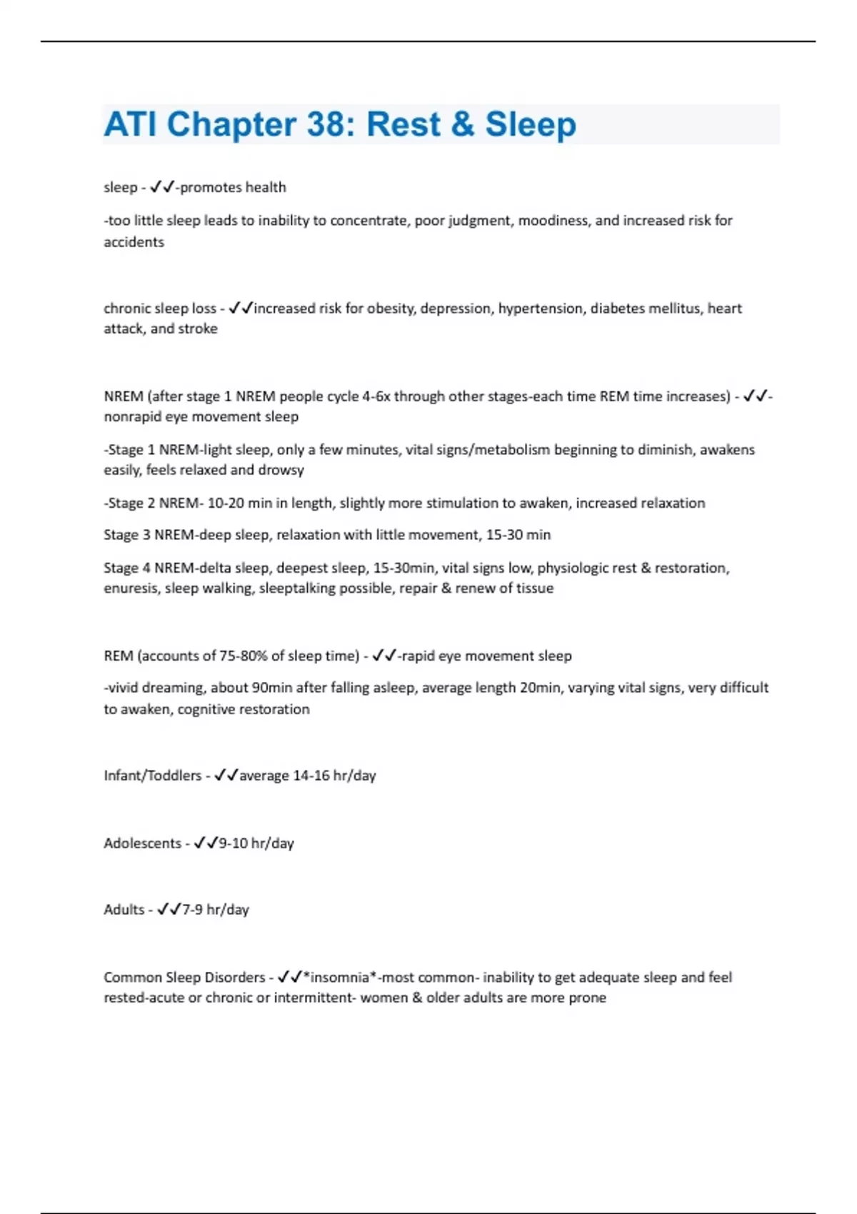 sleep - -promotes health -too little sleep leads to inability to concentrate, poor judgment, moodiness, and increased risk for accidents chronic sleep loss - increased risk for obesity, depression, hypertension, diabetes mellitus, heart attack, and stroke NREM (after stage 1 NREM people cycle 4-6x through other stages-each time REM time increases) - - nonrapid eye movement sleep -Stage 1 NREM-light sleep, only a few minutes, vital signs/metabolism beginning to diminish, awakens easily, feels relaxed and drowsy -Stage 2 NREM- 10-20 min in length, slightly more stimulation to awaken, increased relaxation Stage 3 NREM-deep sleep, relaxation with little movement, 15-30 min Stage 4 NREM-delta sleep, deepest sleep, 15-30min, vital signs low, physiologic rest & restoration, enuresis, sleep walking, sleeptalking possible, repair & renew of tissue REM (accounts of 75-80% of sleep time) - -rapid eye movement sleep -vivid dreaming, about 90min after falling asleep, average length 20min, varying vital signs, very difficult to awaken, cognitive restoration Infant/Toddlers - average 14-16 hr/day Adolescents - 9-10 hr/day Adults - 7-9 hr/day Common Sleep Disorders - *insomnia*-most common- inability to get adequate sleep and feel rested-acute or chronic or intermittent- women & older adults are more prone*sleep apnea* more than 5 breathing cessations lasting longer than 10 seconds per hour during sleep, decreased arterial oxygen saturation levels (central (CNS) or obstructive (mouth, throat, upper airway)) *narcolepsy*-sudden attacks of sleep during waking hours, risk for injury Assessment - sleep patterns, history, recent changes, sleep problems, linear scale (best & worst sleep), factors interfering with sleep (illness, life events, emotional stress, mental illness, diet, exercise, sleep environment, medications - bronchodilators anti-hypertensives)