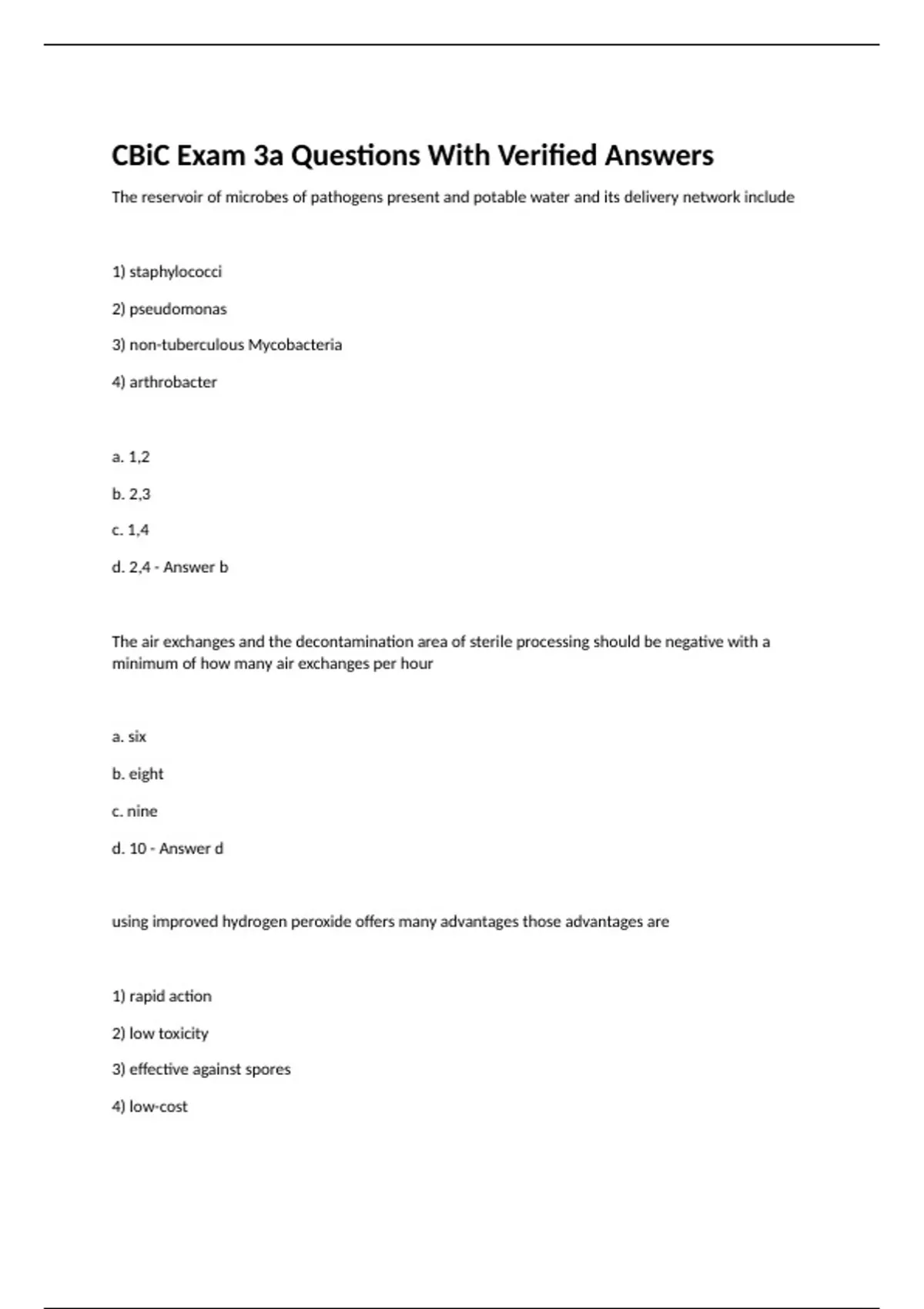 The reservoir of microbes of pathogens present and potable water and its delivery network include 1) staphylococci 2) pseudomonas 3) non-tuberculous Mycobacteria 4) arthrobacter a. 1,2 b. 2,3 c. 1,4 d. 2,4 - Answer b The air exchanges and the decontamination area of sterile processing should be negative with a minimum of how many air exchanges per hour a. six b. eight c. nine d. 10 - Answer d