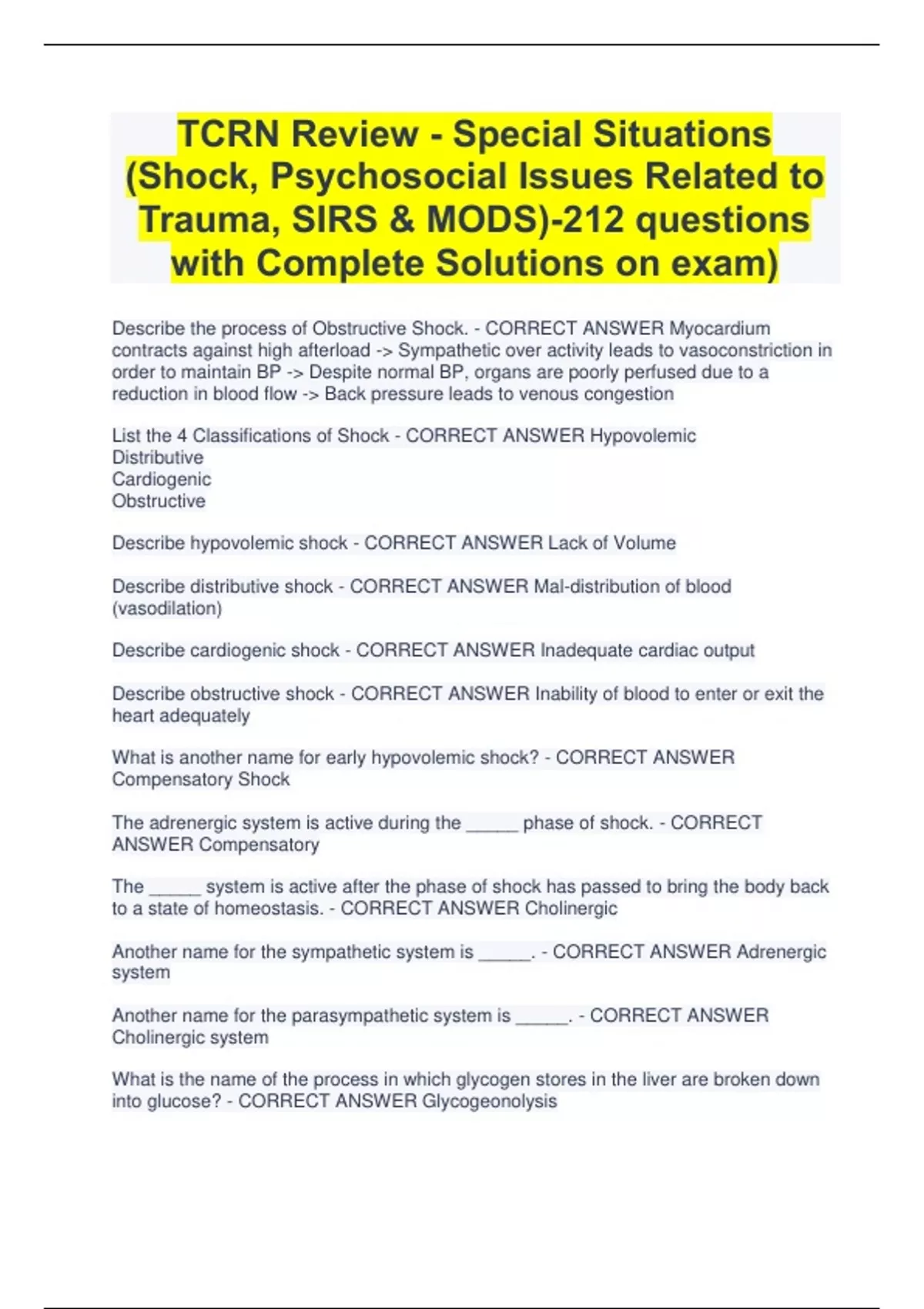 TCRN Review - Special Situations (Shock, Psychosocial Issues Related to Trauma, SIRS & MODS)-212 questions with Complete Solutions on exam) Describe the process of Obstructive Shock. - CORRECT ANSWER Myocardium contracts against high afterload -> Sympathetic over activity leads to vasoconstriction in order to maintain BP -> Despite normal BP, organs are poorly perfused due to a reduction in blood flow -> Back pressure leads to venous congestion List the 4 Classifications of Shock - CORRECT ANSWER Hypovolemic Distributive Cardiogenic Obstructive Describe hypovolemic shock - CORRECT ANSWER Lack of Volume Describe distributive shock - CORRECT ANSWER Mal-distribution of blood (vasodilation) Describe cardiogenic shock - CORRECT ANSWER Inadequate cardiac output Describe obstructive shock - CORRECT ANSWER Inability of blood to enter or exit the heart adequately What is another name for early hypovolemic shock? - CORRECT ANSWER Compensatory Shock The adrenergic system is active during the _____ phase of shock. - CORRECT ANSWER Compensatory The _____ system is active after the phase of shock has passed to bring the body back to a state of homeostasis. - CORRECT ANSWER Cholinergic Another name for the sympathetic system is _____. - CORRECT ANSWER Adrenergic system Another name for the parasympathetic system is _____. - CORRECT ANSWER Cholinergic system What is the name of the process in which glycogen stores in the liver are broken down into glucose? - CORRECT ANSWER Glycogeonolysis What is the process in which glucose in the serum is converted to glycogen for storage in the liver? - CORRECT ANSWER Glyconeogenesis What is the term for the speed at which electricity moves through the heart? - CORRECT ANSWER Automaticity What is the role of alpha receptors in the adrenergic (sympathetic) system? - CORRECT ANSWER Vasoconstriction, Glycogeonolysis, Diaphoresis What is the role of the alpha receptors in the cholinergic (parasympathetic) system? - CORRECT ANSWER Vasodilation, Glyconeogenesis, Dry Skin