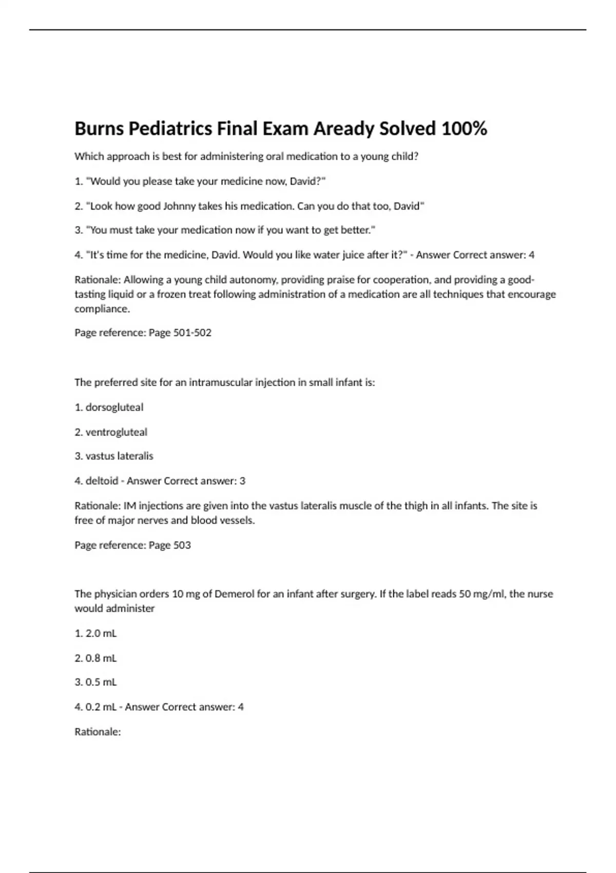 Which approach is best for administering oral medication to a young child? 1. "Would you please take your medicine now, David?" 2. "Look how good Johnny takes his medication. Can you do that too, David" 3. "You must take your medication now if you want to get better." 4. "It's time for the medicine, David. Would you like water juice after it?" - Answer Correct answer: 4 Rationale: Allowing a young child autonomy, providing praise for cooperation, and providing a good-tasting liquid or a frozen treat following administration of a medication are all techniques that encourage compliance. Page reference: Page 501-502 The preferred site for an intramuscular injection in small infant is: 1. dorsogluteal 2. ventrogluteal 3. vastus lateralis 4. deltoid - Answer Correct answer: 3 Rationale: IM injections are given into the vastus lateralis muscle of the thigh in all infants. The site is free of major nerves and blood vessels. Page reference: Page 503 The physician orders 10 mg of Demerol for an infant after surgery. If the label reads 50 mg/ml, the nurse would administer 1. 2.0 mL 2. 0.8 mL 3. 0.5 mL 4. 0.2 mL - Answer Correct answer: 4 Rationale: Page reference: Page 509 Box 22-2 Which of the following medication can be crushed when administered to a pediatric patient? 1. Potassium chloride (Slo-K" capsule 2. Colace gel tablets ( Docusate) 3. Ditropan XL tablets (oxybutynin) 4. Simethicone tablet - Answer Correct answer: 4 Rationale: Most pediatric medications are available in liquid, suspension, or chewable tablets. Only scored tablets should be divided. Extended-release tablets and medication in capsule form, such as Ditropan XL (oxybutynin) and potassium chloride (Slo-K), should not be chewed or crushed. Gel tablets, such as Colace (docusate sodium) should not be cut or dissolved. Page reference: Page 501 The mother and grandmother of a child are at the bedside, rubbing the skin of a child when the nurse enters the room, the visitors a startled and drop the item they were rubbing against the child's skin. The nurse picks up the item and recognizes it as a penny. The best response of the nurse is to? 1. ask, "What on earth are you doing to that child with this penny?" 2. Give a penny back to mother leave the room to give them their privacy. 3. Tell them that they could hurt the child with the penny and there are many germs on coins. 4. Return the paint to the mother an open dialogue about the practices are using. - Answer Correct answer: 4 Rationale: Cultural practices need to be considered, and an open dialogue about these practices will help the health care team to understand the reasoning behind them. As long as patient safety is not compromised, the caregivers should allow these practices to take place. Communication should reflect a nonjudgmental attitude on the part of the caretaker. If the cultural practice compromises safety or is against hospital policy, the health care provider should educate the patient and family members as to why the practice should not take place in the hospital setting. Page reference: Page 490 (See also Chapter 24 Page 575.) What is the most effective position for the nurse to place a toddler in to administer medications? Semi-sitting position on a nurse's lap Sitting in a high chair Semi-Fowler's in a crib Standing after providing an explanation - Answer Semi-sitting position on a nurse's lap Toddlers are usually going to resist and this will allow for the most effective method to administer medications.REF: Page 501 A child on the pediatric unit has an order for a 24-hour urine specimen. Six hours after initiating the specimen collection the parents inform nursing staff that the child was incontinent. What instruction does the nurse provide to the parents at this time? Lost specimens necessitate restarting the test. The specimen can now be sent to the laboratory. They should continue collecting the child's urine. The child will now require a straight catheterization to obtain urine. - Answer Lost specimens necessitate restarting the test. At times a 24-hour urine specimen may be requested to determine the rate of urine production and measure the excretion of specific chemicals from the body. The nurses on each shift must closely supervise this test to maintain its accuracy, because lost specimens necessitate restarting the test.REF: Page 497 The nurse enters the room of a 2-month-old patient and observes the infant actively feeding with a propped formula bottle. What fact related to propping bottles should the nurse consider when preparing education for the family at this time? It is an effective technique for feeding. It significantly increases choking risk. It is a common cultural practice and requires respect. It will assist the infant to learn how to hold the bottle independently. - Answer It significantly increases choking risk. Propped nursing bottles or force-feeding small children can lead to choking.REF: Page 488 Which procedure could be performed to obtain spinal fluid for examination? Thoracentesis Needle aspiration Lumbar puncture Bone marrow aspiration - Answer Lumbar puncture A lumbar puncture is also referred to as a spinal tap and is done to obtain spinal fluid for examination or to reduce pressure within the brain in conditions such as hydrocephalus or meningitis.REF: Page 498 A 3-year-old patient requires a pulse assessment. Which anatomical area is the best to assess the toddler's pulse? Radial Popliteal Apical Carotid - Answer Apical The pulse of the older child is taken just like that of an adult. Apical pulses are advised for children younger than 5 years of age.REF: Page 491 Which of the following statements are appropriate when administering medications to children? Select all that apply. The nurse should plan additional time for administering medications to children. The nurse may leave non-narcotic pain relievers at the bedside for an adolescent. The nurse will find that resistive behavior to taking medications is at a peak with todd