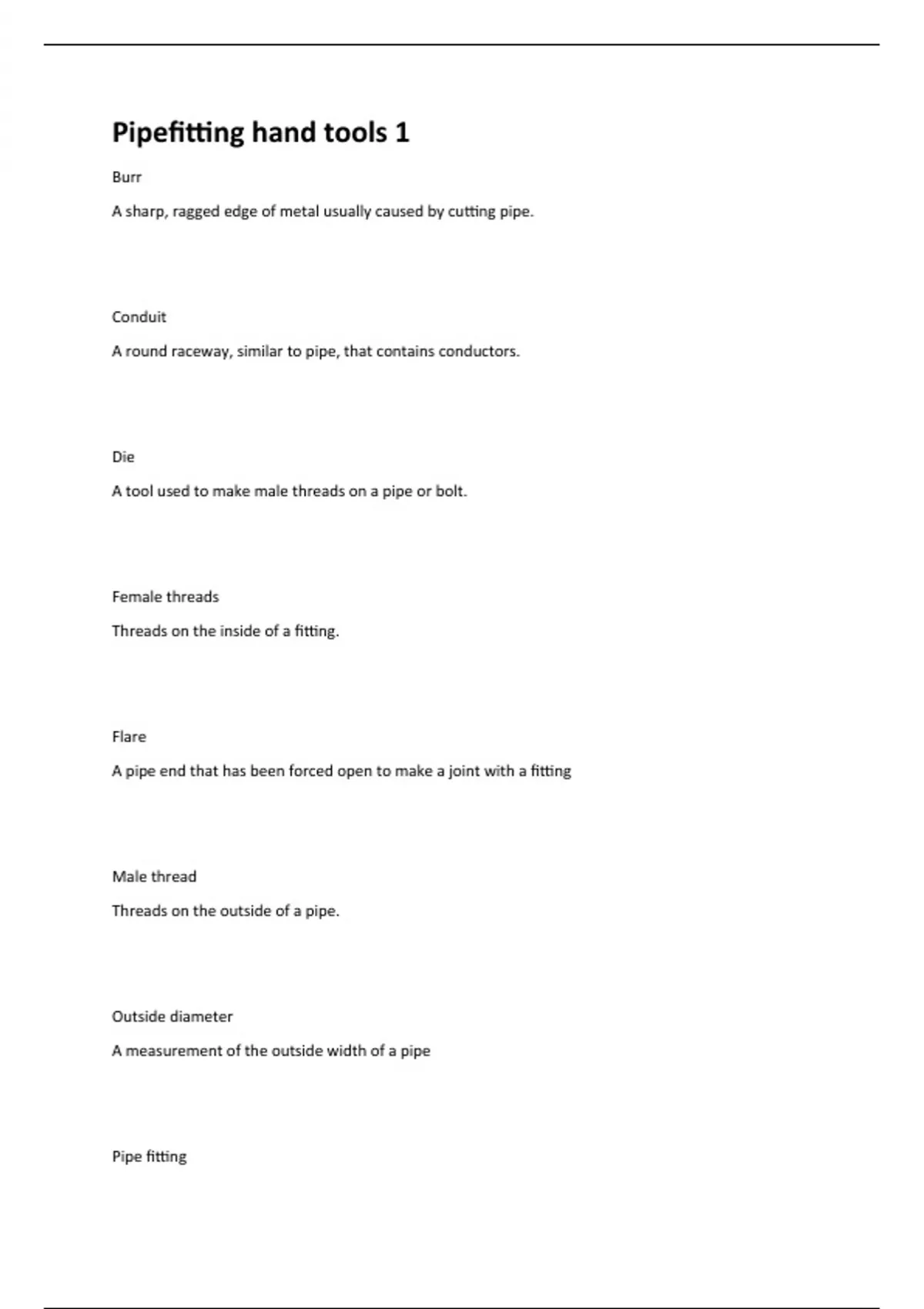 Burr A sharp, ragged edge of metal usually caused by cutting pipe. Conduit A round raceway, similar to pipe, that contains conductors. Die A tool used to make male threads on a pipe or bolt. Female threads Threads on the inside of a fitting