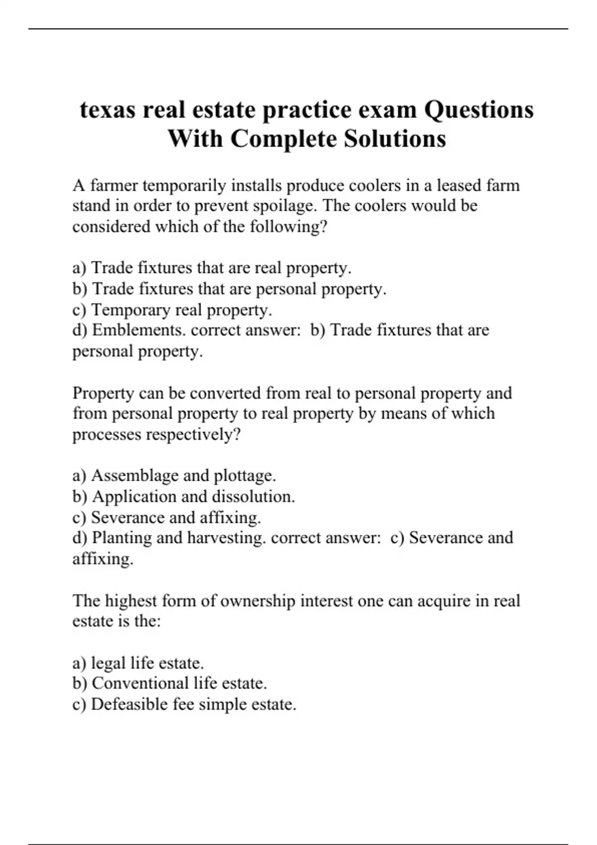 A farmer temporarily installs produce coolers in a leased farm stand in order to prevent spoilage. The coolers would be considered which of the following? a) Trade fixtures that are real property. b) Trade fixtures that are personal property. c) Temporary real property. d) Emblements. correct answer: b) Trade fixtures that are personal property. Property can be converted from real to personal property and from personal property to real property by means of which processes respectively? a) Assemblage and plottage. b) Application and dissolution. c) Severance and affixing. d) Planting and harvesting. correct answer: c) Severance and affixing. The highest form of ownership interest one can acquire in real estate is the: a) legal life estate. b) Conventional life estate.