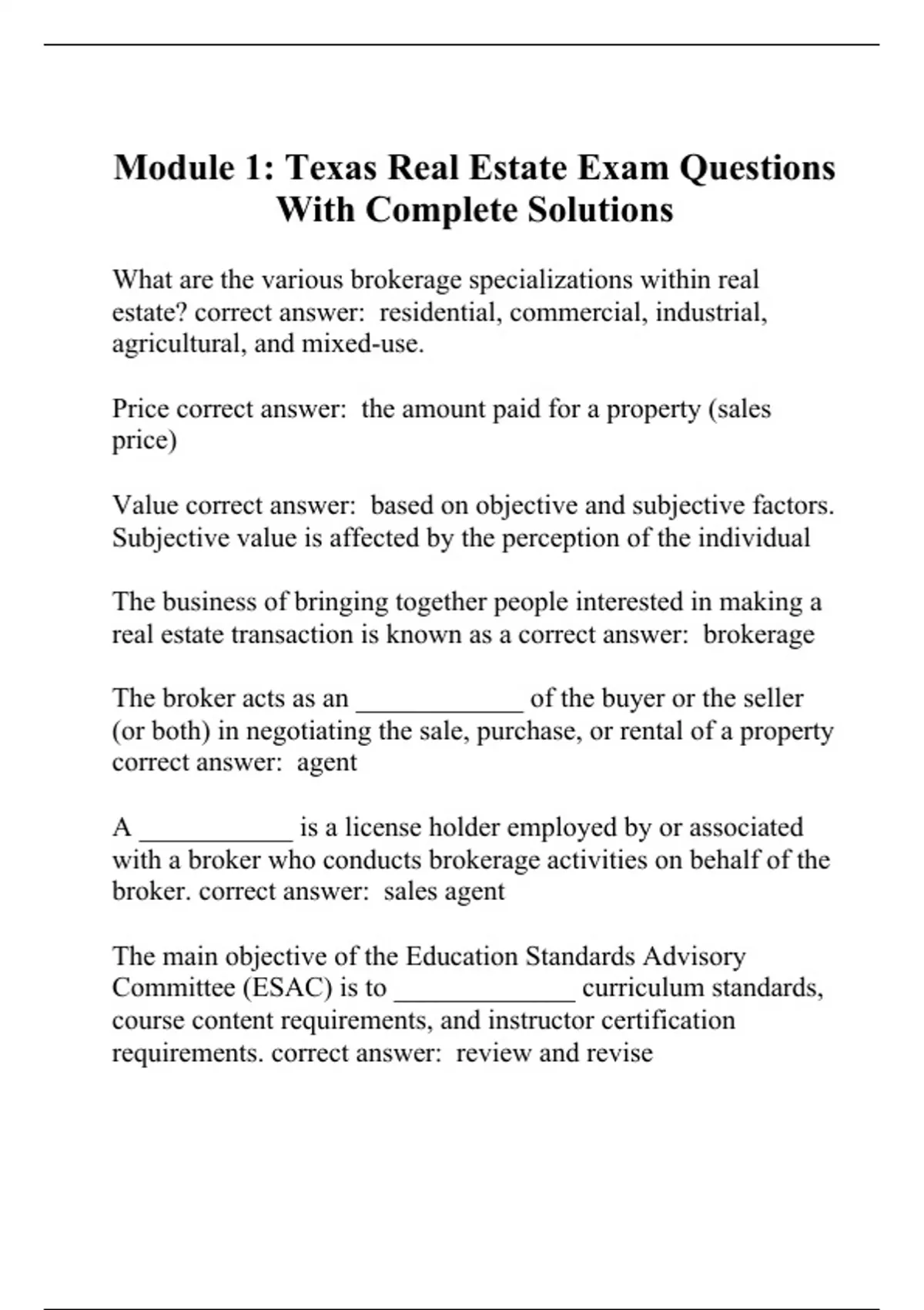 Module 1: Texas Real Estate Exam Questions With Complete Solutions