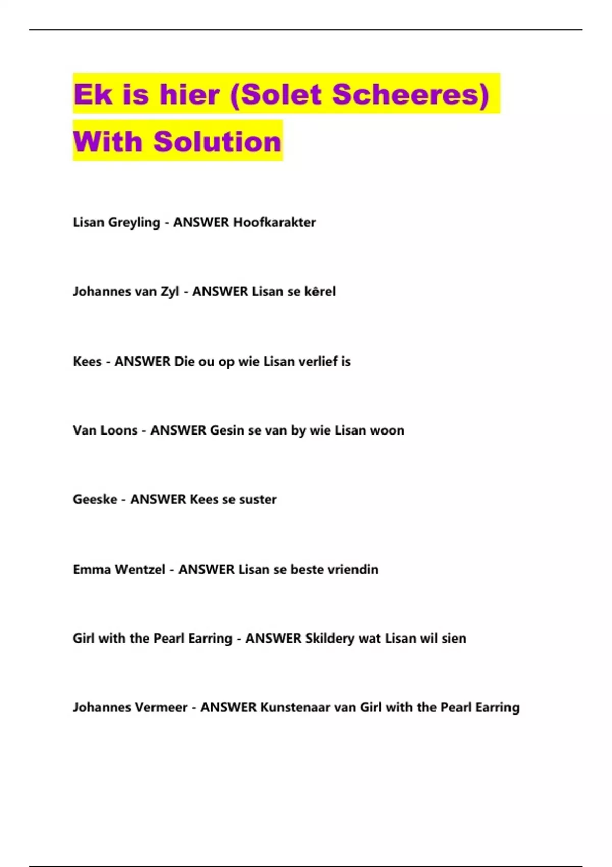 Ek is hier (Solet Scheeres) With Solution Lisan Greyling - ANSWER Hoofkarakter Johannes van Zyl - ANSWER Lisan se k êrel Kees - ANSWER Die ou op wie Lisan verlief is Van Loons - ANSWER Gesin se van by wie Lisan woon Geeske - ANSWER Kees se suster Emma Wentzel - ANSWER Lisan se beste vriendin Girl with the Pearl Earring - ANSWER Skildery wat Lisan wil sien Johannes Vermeer - ANSWER Kunstenaar van Girl with the Pearl Earring Nederland - ANSWER Land waar Lisan woon vir 2 maande Suid-Afrika - ANSWER Lisan se tuisland Afrikaans - ANSWER Taal wat Lisan praat Nederlands - ANSWER Taal wat Lisan leer Breda - ANSWER Ruimte (dorp waar Lisan woon) Mauritshuis - ANSWER Plek waar Girl with the Pearl Earring hang Winkel waar dagga verkoop word - ANSWER Wat is 'n "Coffee shop" in Nederland? Plek waar koffie gedrink word - ANSWER Wat is 'n "Coffee shop" in Suid-Afrika? Agt - ANSWER Hoeveelheid e-posse in kortverhaal