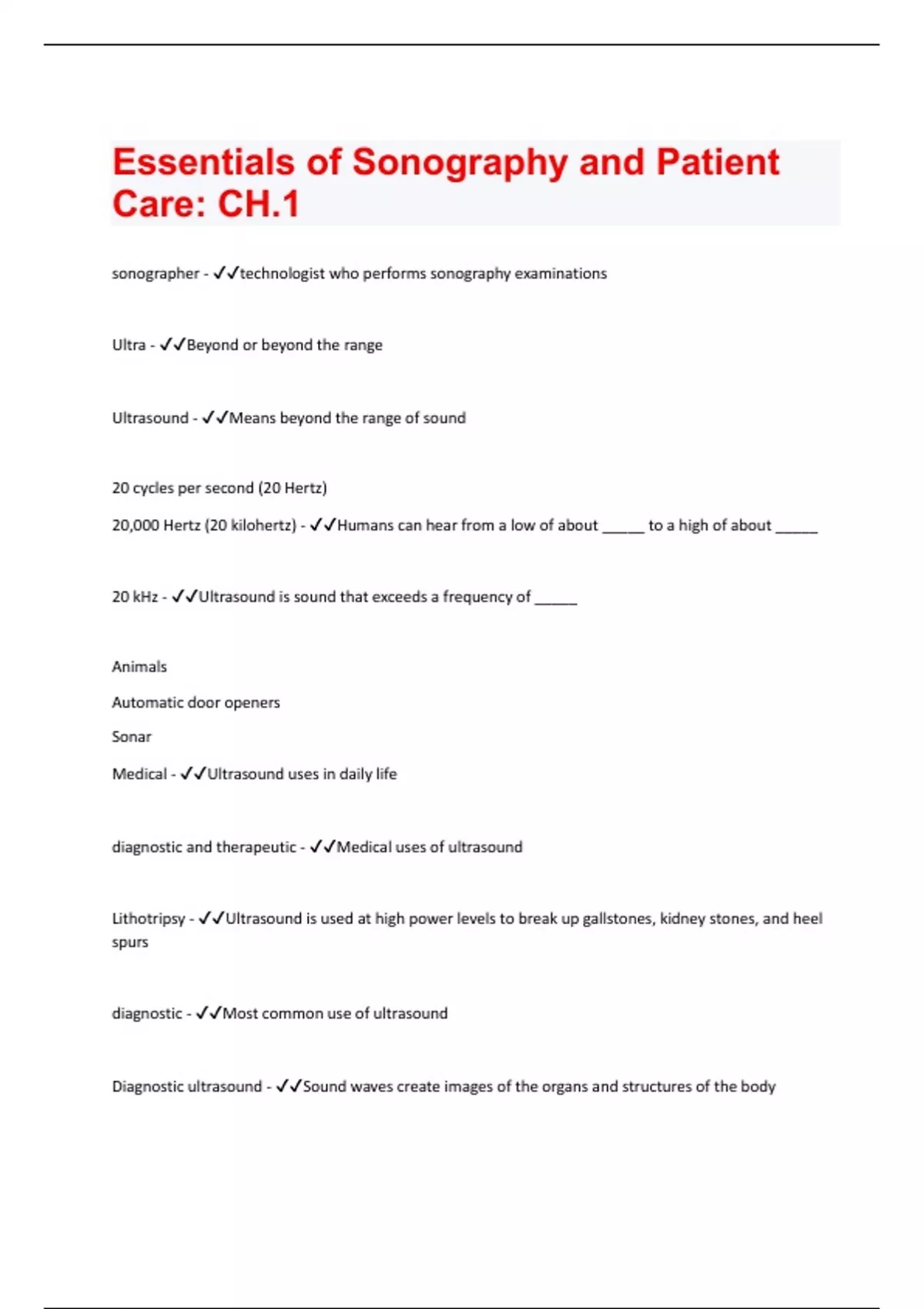 sonographer - technologist who performs sonography examinations Ultra - Beyond or beyond the range Ultrasound - Means beyond the range of sound 20 cycles per second (20 Hertz) 20,000 Hertz (20 kilohertz) - Humans can hear from a low of about _____ to a high of about _____ 20 kHz - Ultrasound is sound that exceeds a frequency of _____ Animals Automatic door openers Sonar Medical - Ultrasound uses in daily life diagnostic and therapeutic - Medical uses of ultrasound Lithotripsy - Ultrasound is used at high power levels to break up gallstones, kidney stones, and heel spurs diagnostic - Most common use of ultrasound Diagnostic ultrasound - Sound waves create images of the organs and structures of the body1 megahertz (MHz) 18-20 MHz - Diagnostic Sonography uses frequencies between _____ and a current high of _____to _____