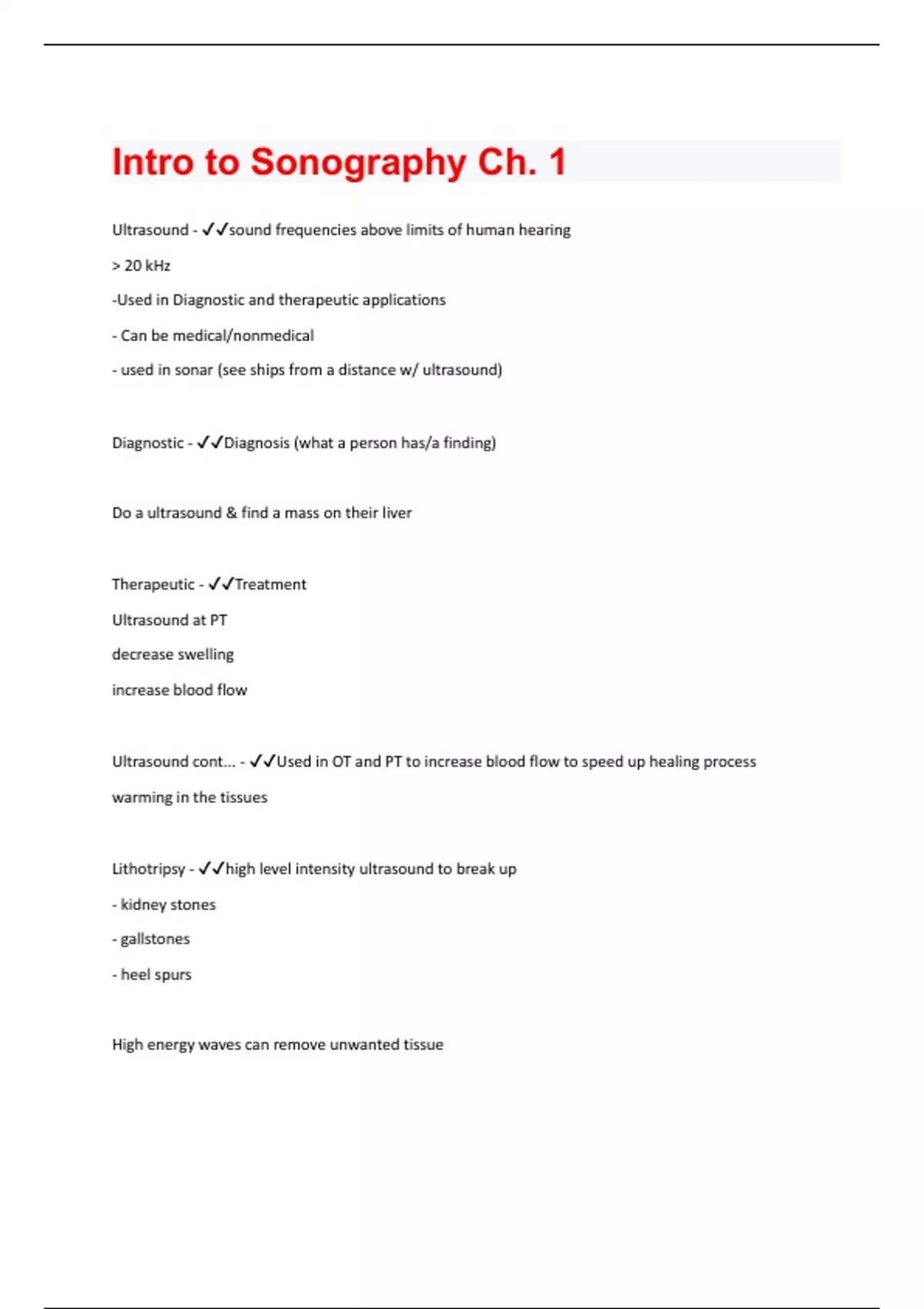 Ultrasound - sound frequencies above limits of human hearing > 20 kHz -Used in Diagnostic and therapeutic applications - Can be medical/nonmedical - used in sonar (see ships from a distance w/ ultrasound) Diagnostic - Diagnosis (what a person has/a finding) Do a ultrasound & find a mass on their liver Therapeutic - Treatment Ultrasound at PT decrease swelling increase blood flow Ultrasound cont... - Used in OT and PT to increase blood flow to speed up healing process warming in the tissues Lithotripsy - high level intensity ultrasound to break up - kidney stones - gallstones - heel spurs High energy waves can remove unwanted tissueMost common use of Ultrasound - Diagnostic -> low intensity waves to visualize interior of body